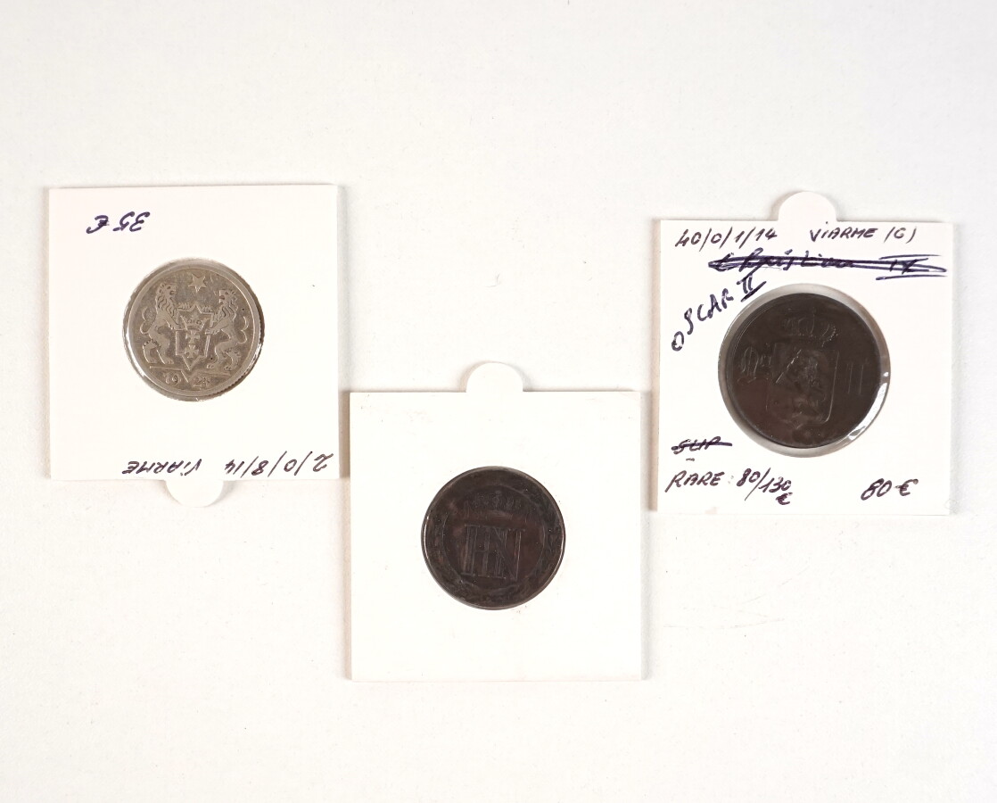 Ensemble de 3 monnaies comprenant : - Norvège : 5 Öre 1875 Oscar II - Dantzig Ville libre : 1 Gulden 1923, argent - Westphalie : 20 Centimes Jerome Napoléon 1808 C.