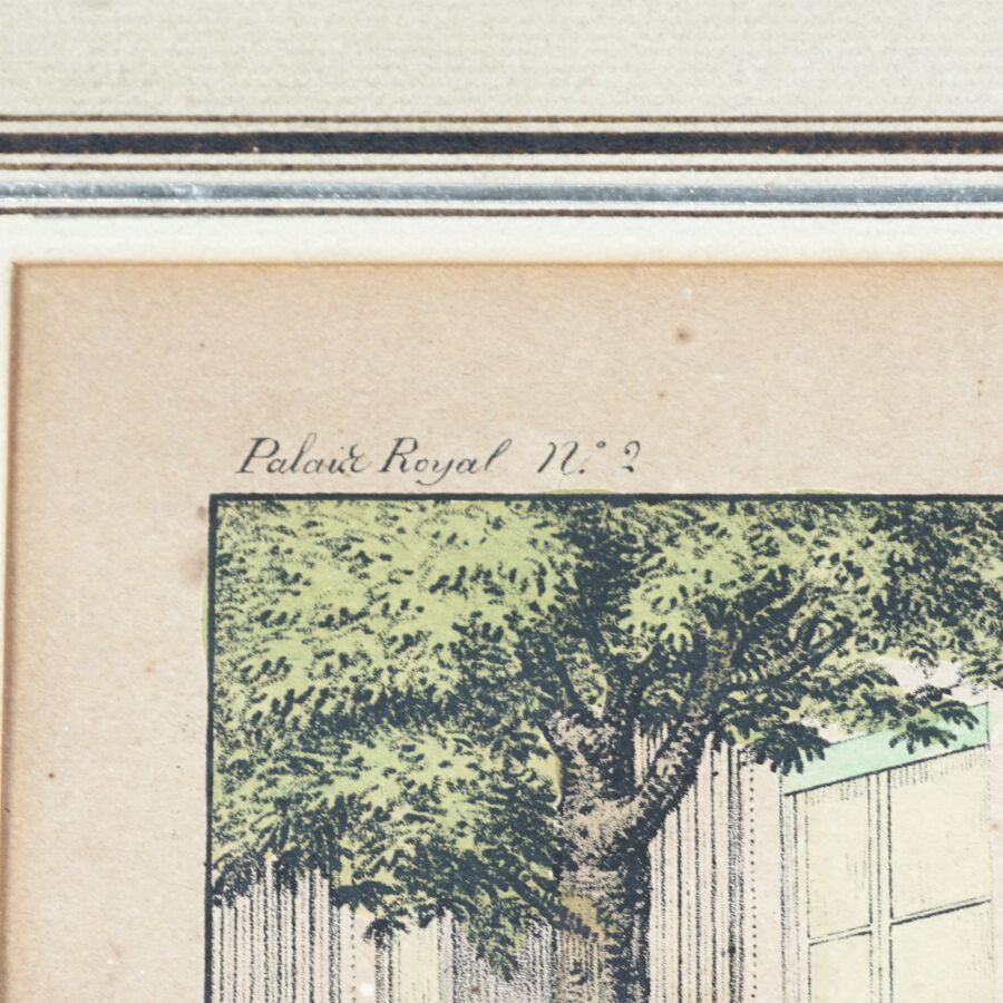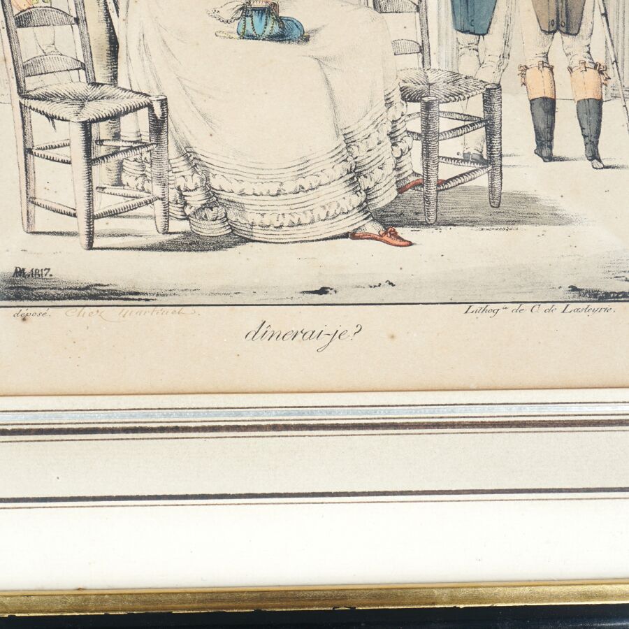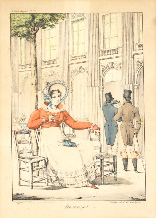 - D'après Charles Philibert DE LAYSTERIE (1759-1849), "Dinerai-je ?, Palais Royal", gravure en couleurs, époque Restauration, 29.5 x 21 cm,