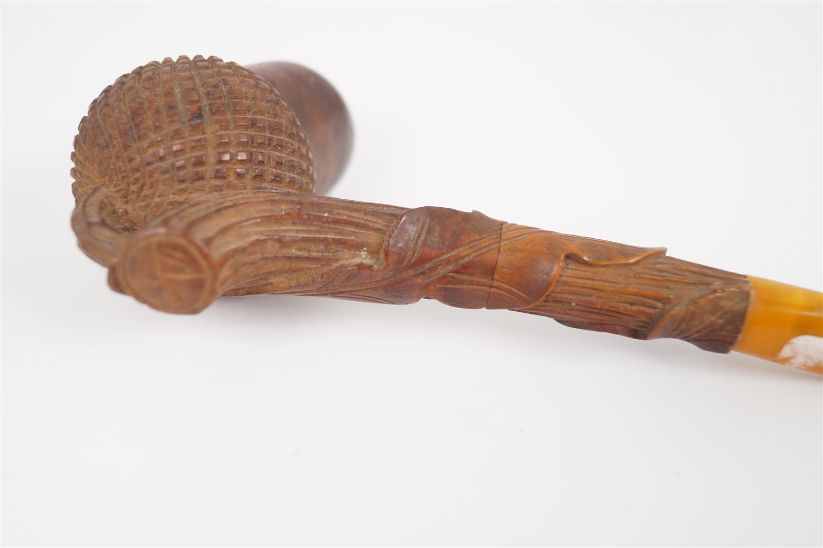 Ensemble de 3 pipes dont : un curieux modèle représentant un soulier, un autre modèle imitant un gland de chêne et un dernier modèle exécuté dans les tranchées entre 1917 et 1918 "Mont Didier Verdun", patronyme de Kemmel, L. 20, 14 et 6 cm (accident à un des tuyaux, fentes)