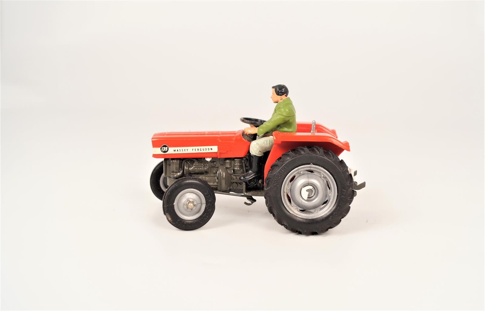 Ensemble de 3 tracteurs agricoles miniatures, diverses marques, sans boîtes comprenant : MAJORETTE, 1 tracteur agricole rouge ; 1 remorque agricole YAXON, rouge et jaune ; 1 tracteur agricole FIAT, fabrication anglaise, rouge avec pilote mobile ; 1 tracteur MASSEY FERGUSSON, rouge, avec pilote, L. de 10.3 à 14 cm.
