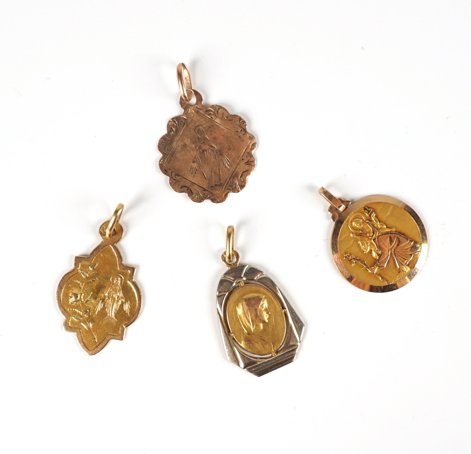 Ensemble de 4 médailles religieuses en or 18 K (750/oo) certaines gravées au revers. Poids brut : 5.4 g environ.