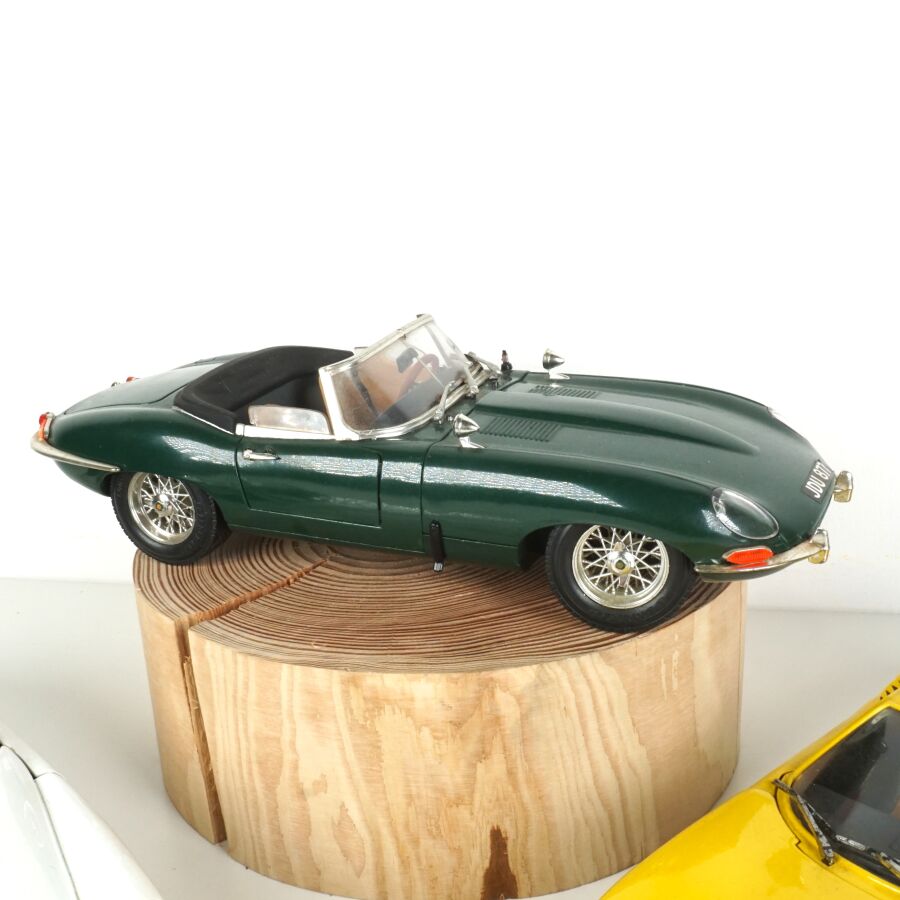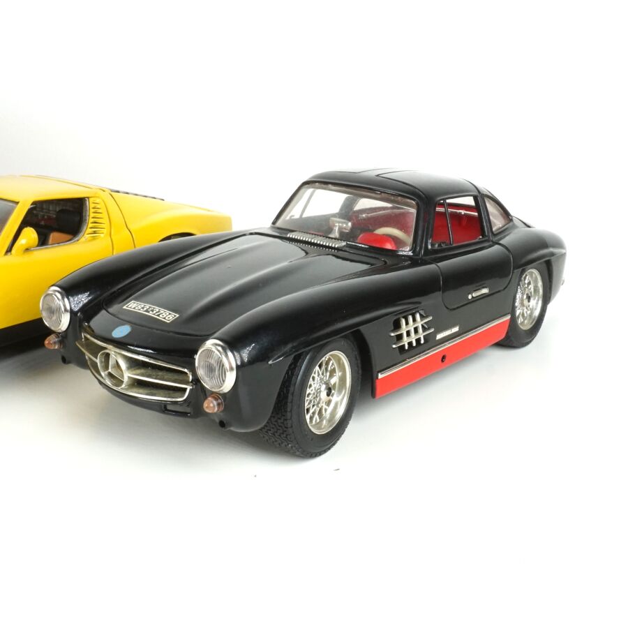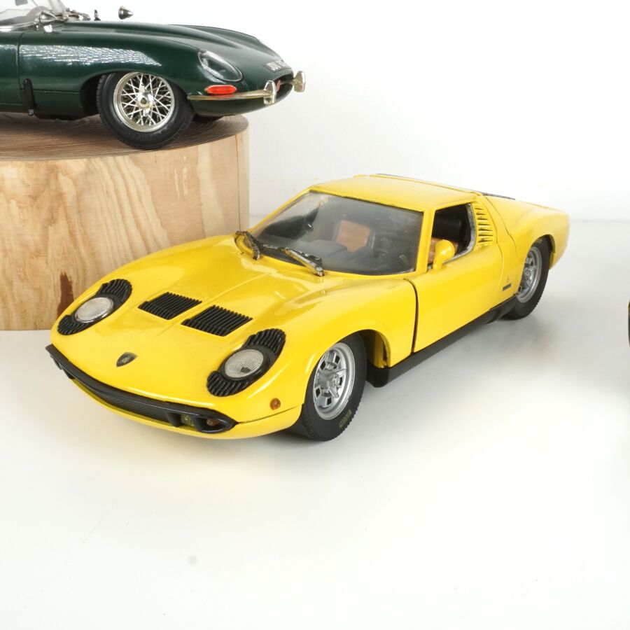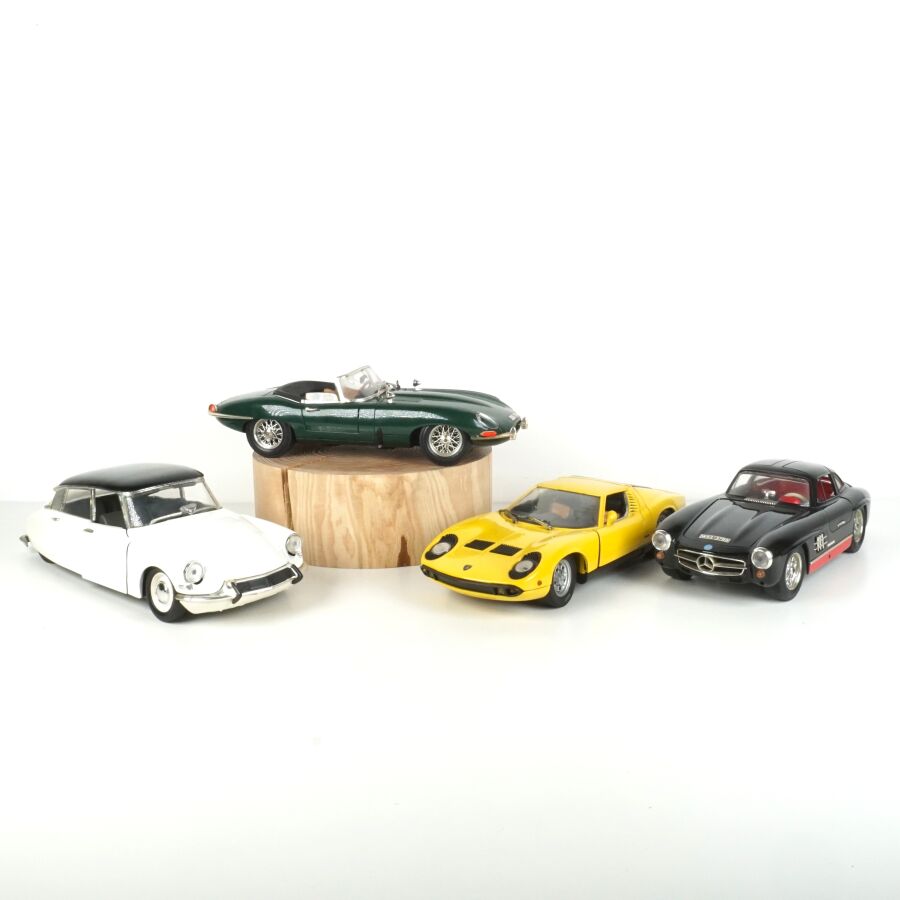 Ensemble de 4 véhicules, échelle 1/18ème, comprenant (1) ANSON : Lamborghini Muira, jaune ; (1) BURAGO : Mercedes-Benz 300SL, noire ; (1) BURAGO : Jaguar "E", 1981, verte et (1) SOLIDO : Citroën DS 19, blanche (usures).