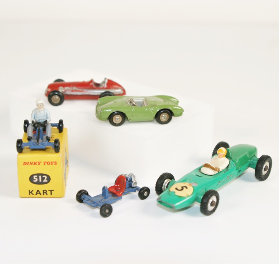 Ensemble de 4 voitures miniatures comprenant : Lotus Racing Car, réf. 241, avec son conducteur ; SCHUCO PICCOLO : Porsche Spider, réf. 708 ; Maserati, réf. 706 ; DINKY TOYS : Kart Leskokart Midjet bleu, réf. 512, avec son pilote en chemise bleu, dans sa boîte d'origine ; Kart Leskokart Midjet bleu, réf.512 (pilote et volant manquant, usures et manques sur les peintures, inscription sur la boîte).
