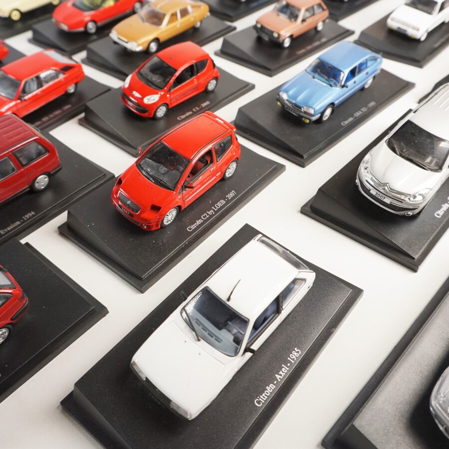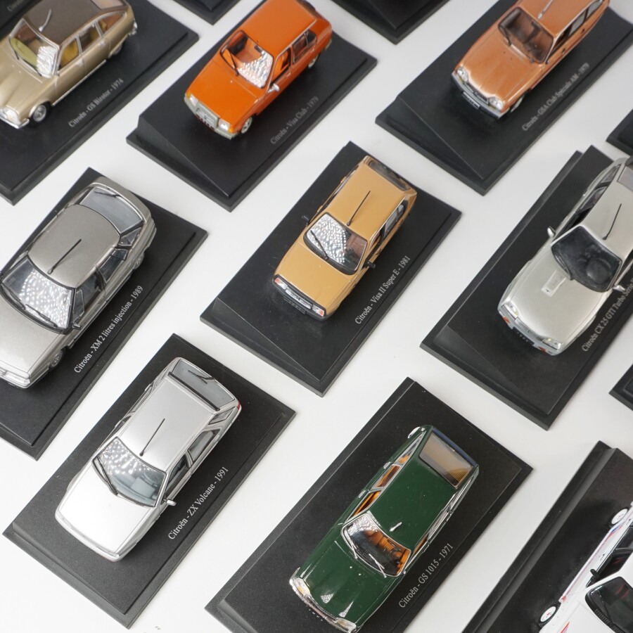 Ensemble de 46 Citroën miniatures sur socle d'origine comprenant notamment 1 Activa 1, 1988 ; 1 Activa II, 1990 ; 1 BX 4TC, 1986 ; GSA Club spéciale AM, 1979 ; Visa II Chrono, 1982 ; 1 ZX Rallye raid, 1992 et MEP X27, 1971 (sans boîte plastique, bel état général).