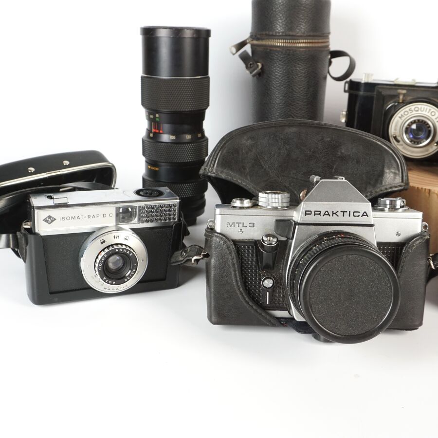 Ensemble de 5 appareils photos comprenant KODAK Instamatic 104, AGFA isomat-rapid, MOSQUITO II optique Superitar Paris, KODAK instamatic 155-X et PRAKTICA MTL3, certains dans leur étui (usures, en l'état).