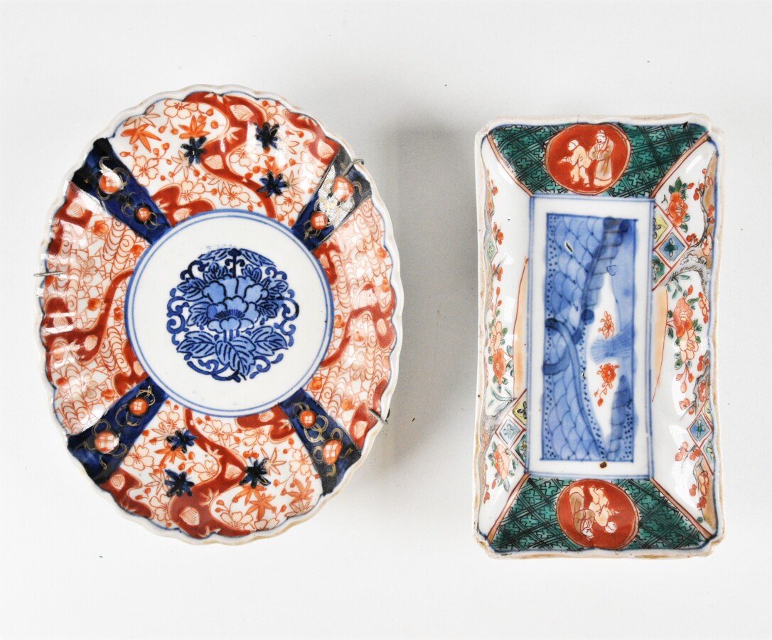 Ensemble de 5 coupes en porcelaine d'Imari de diverses formes dont oblongues, carrées et ovales, à décor de bouquet fleuri, de paysage et de végétaux stylisés, L. de 17 cm à 22 cm (quelques usures et rayures d'usage).