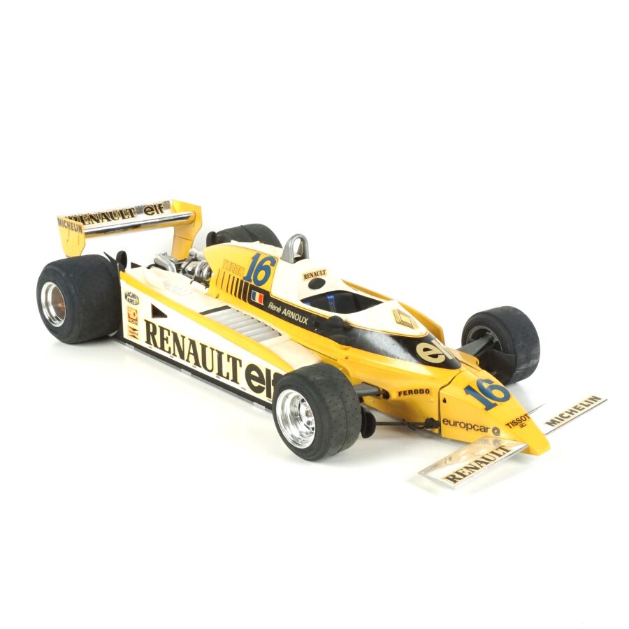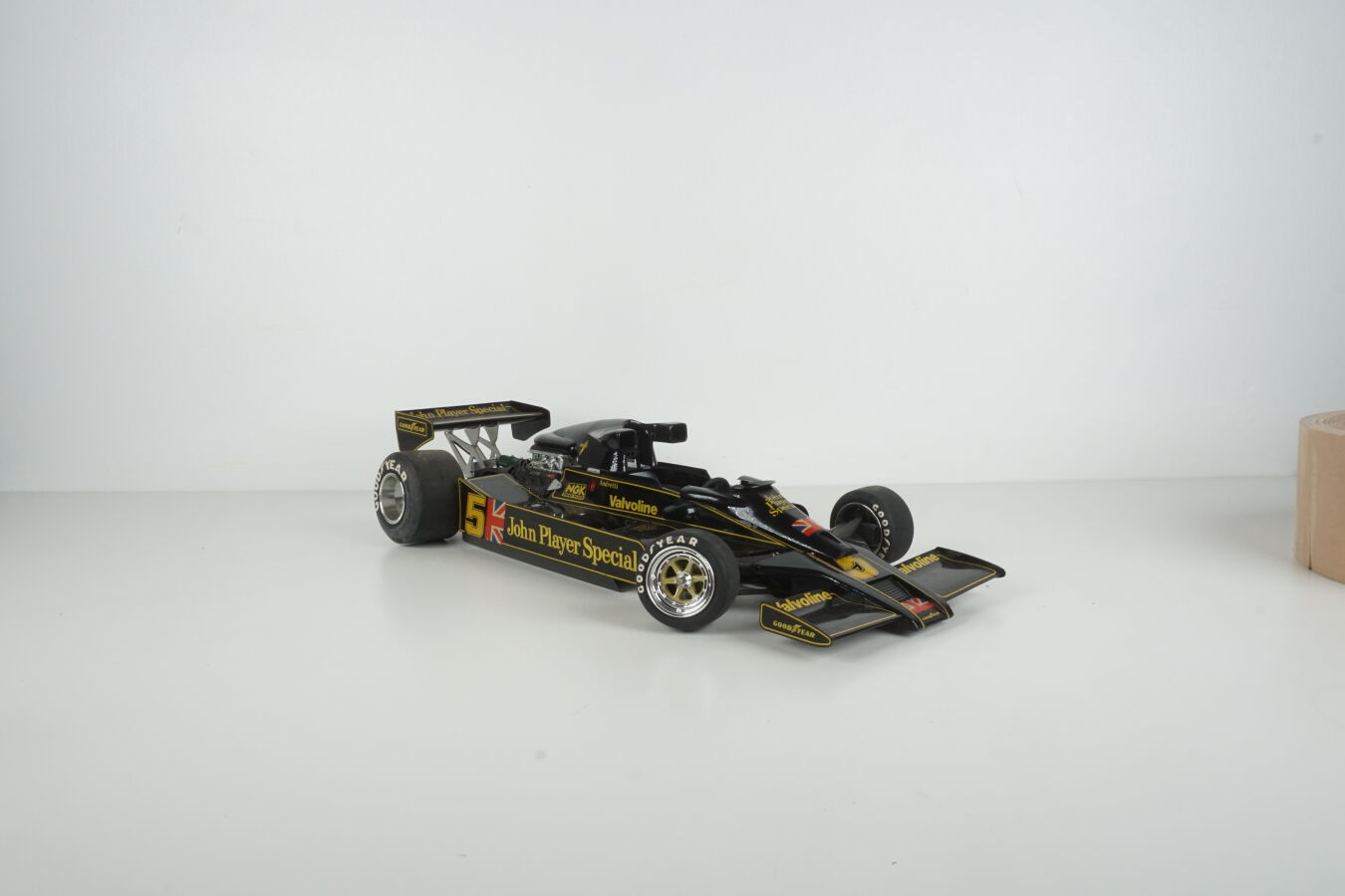 Ensemble de 5 maquettes de Formule 1, probablement échelle 1/12ème, comprenant (1) Lotus Ford 79, No.5, John Player Team Lotus ; (1) Ford JS11 No. 26, Jacques LAFFITE (1943), winner GP Brazilian 1979 ; (1) Tyrrell P34, No. 4, Patrick DEPAILLER (1944-1980), Suède 1976 ; (1) Wolf WR1, No. 20, Jody SCHECKTER (1950), vainqueur GP Monaco 1977 et (1) Renault RS10, No. 16, René ARNOUX (1948), 1979 (en l'état).