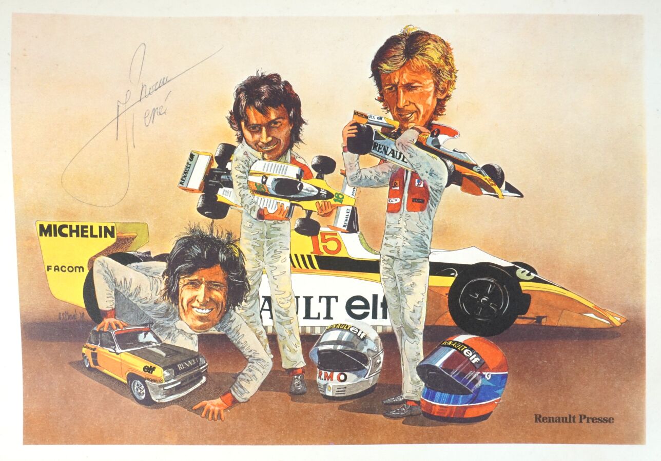 On y joint une caricature de René ARNOUX et deux autres pilotes, dédicacée par René ARNOUX.