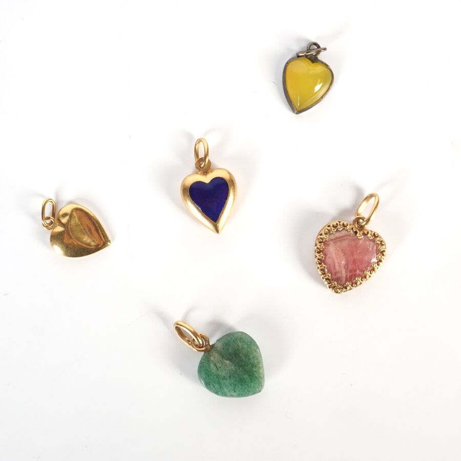 Ensemble de 5 pendentifs "Coeur", dont 4 en or jaune 18K (750/oo), le dernier en argent (800/oo), à décor émaillé ou serti de pierres dures, H. de 2 à 2.5 cm. Poids brut : 8.7 g environ.
