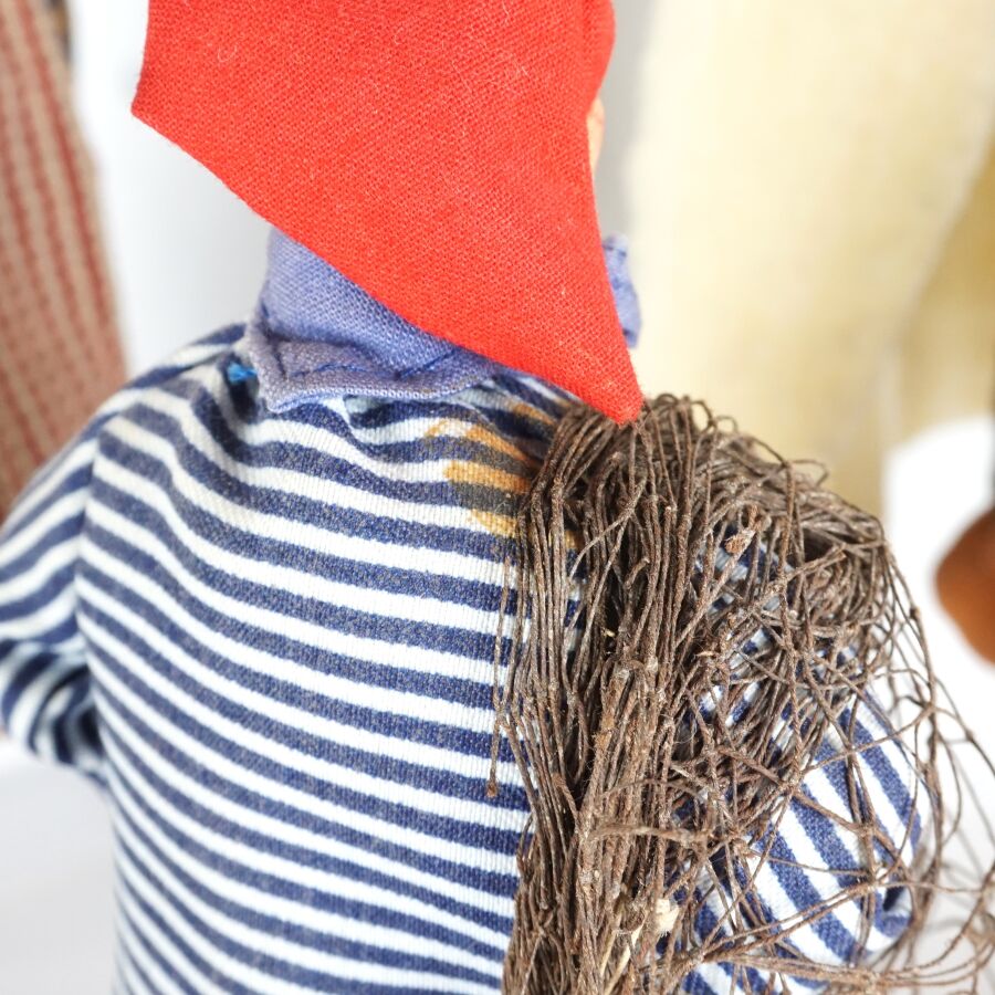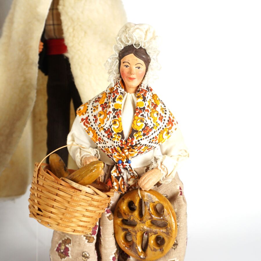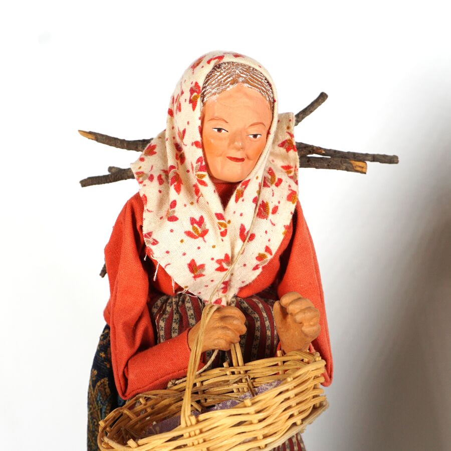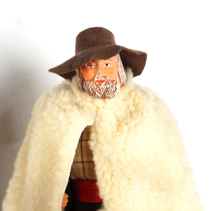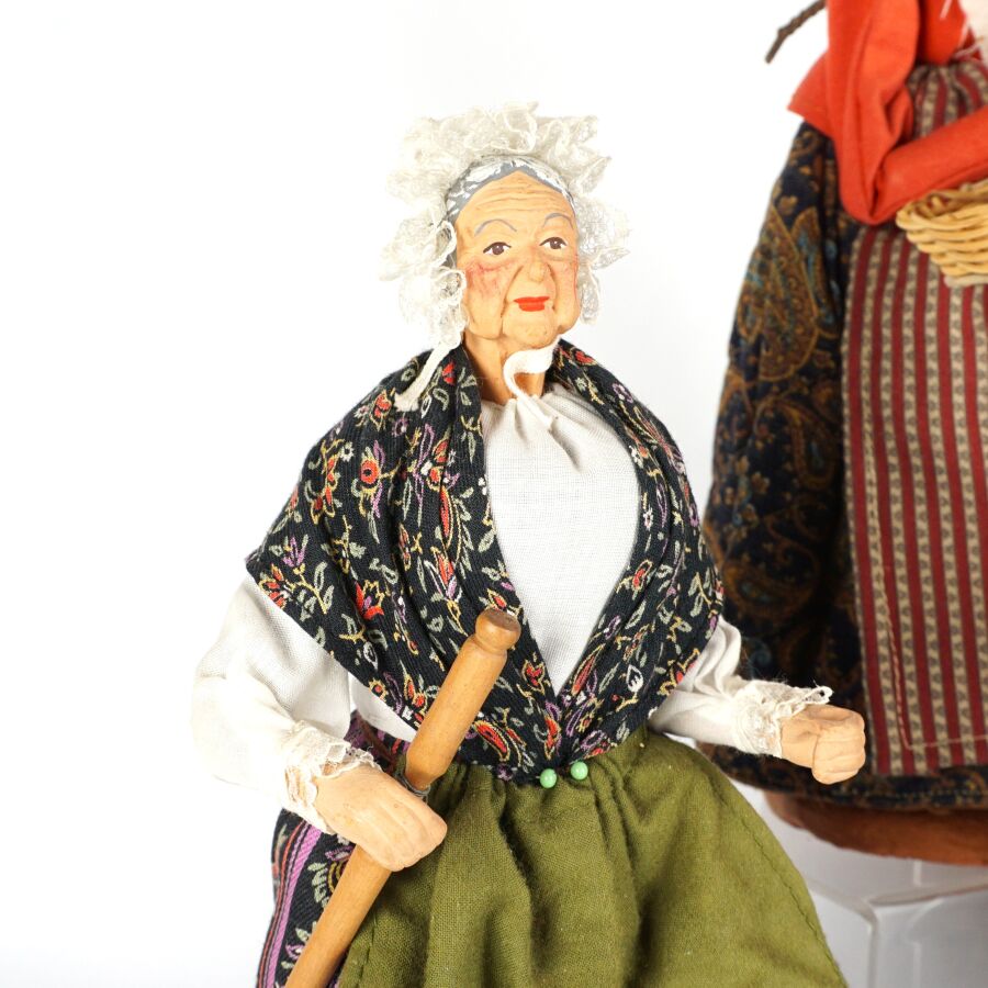 Ensemble de 5 santons figurant un berger, un pécheur, une fromagère, une paysanne et une ménagère, H. 26 cm environ (tâche sur au dos du pêcheur, manques).