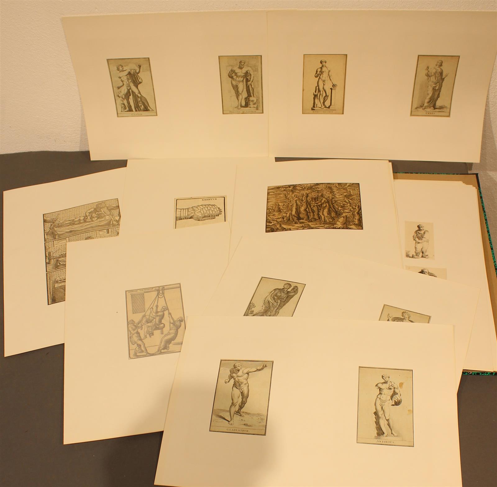Ensemble de 56 gravures, principalement bois et burins, des XVIème et XVIIème siècle sur des sujets divers (jeux, médecine, militaires, cuisine, antiquités, cartes, titres frontispices, etc.) - Bel ensemble de gravures présentées pour la plupart sous passepartout.