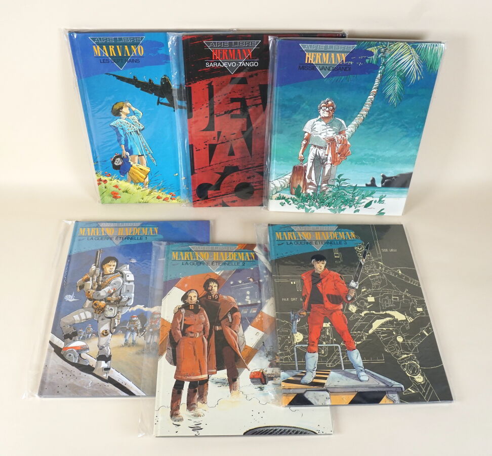 Ensemble de 6 albums de la Collection Aire Libre, dont : Sarajevo Tango par Hermann - Missié Vandisandi par Hermann - Les Sept Nains par Marvano - La Guerre Eternelle par Marvano et Haldeman (Tomes 1 à 3) - ed. Dupuis - Très bon état.