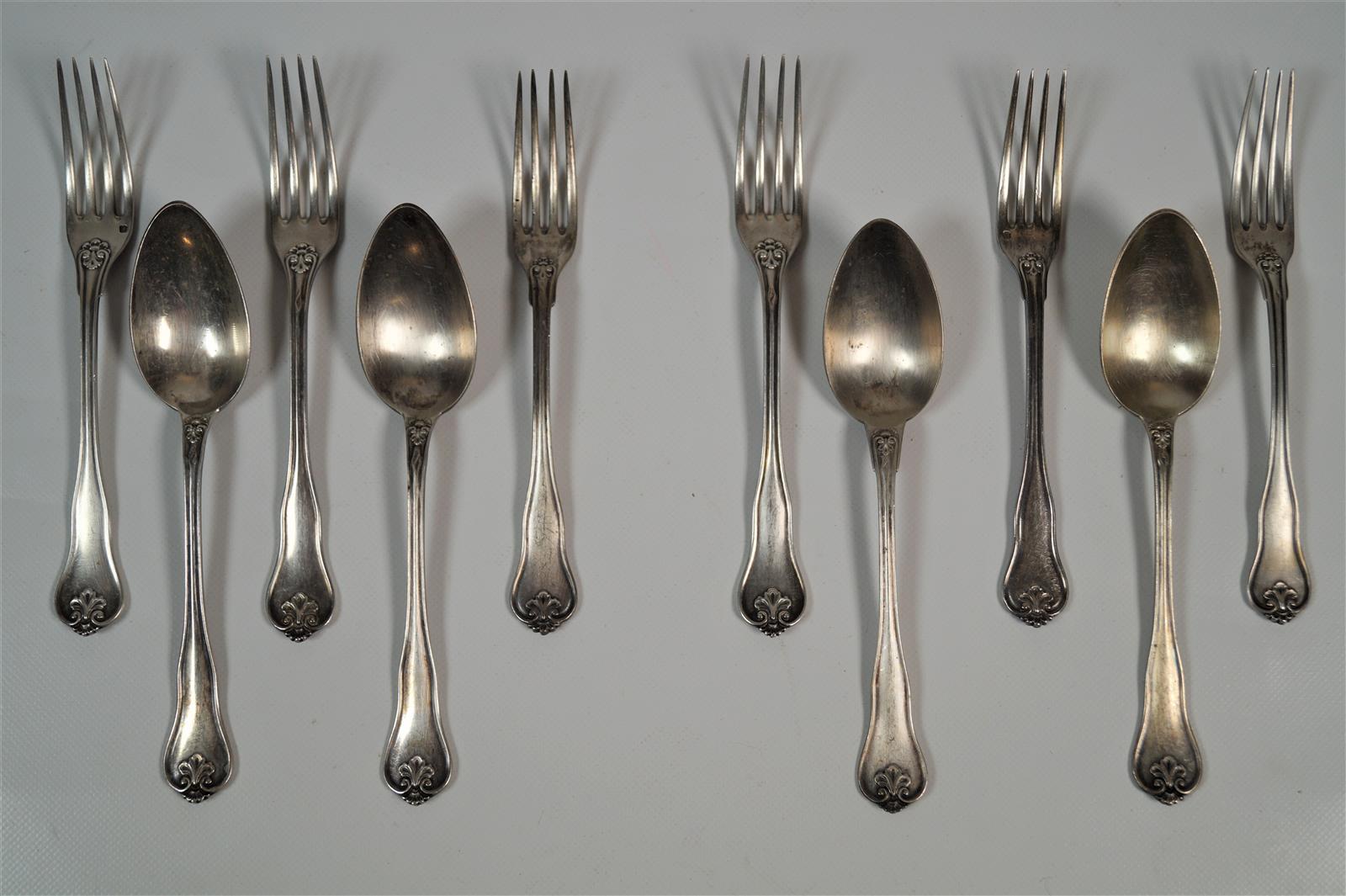 Ensemble de 6 fourchettes et 4 cuillères en argent massif, modèle violonné et monogrammé à décor de coquilles. Poids brut : 460 g environ.