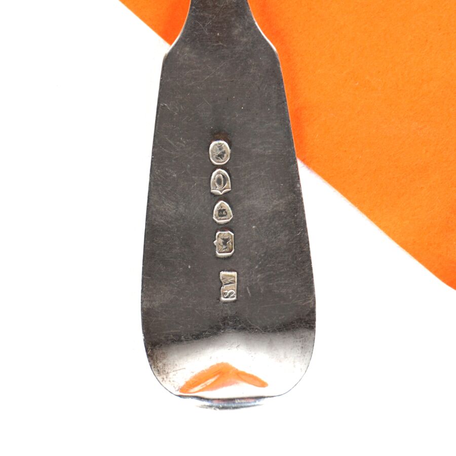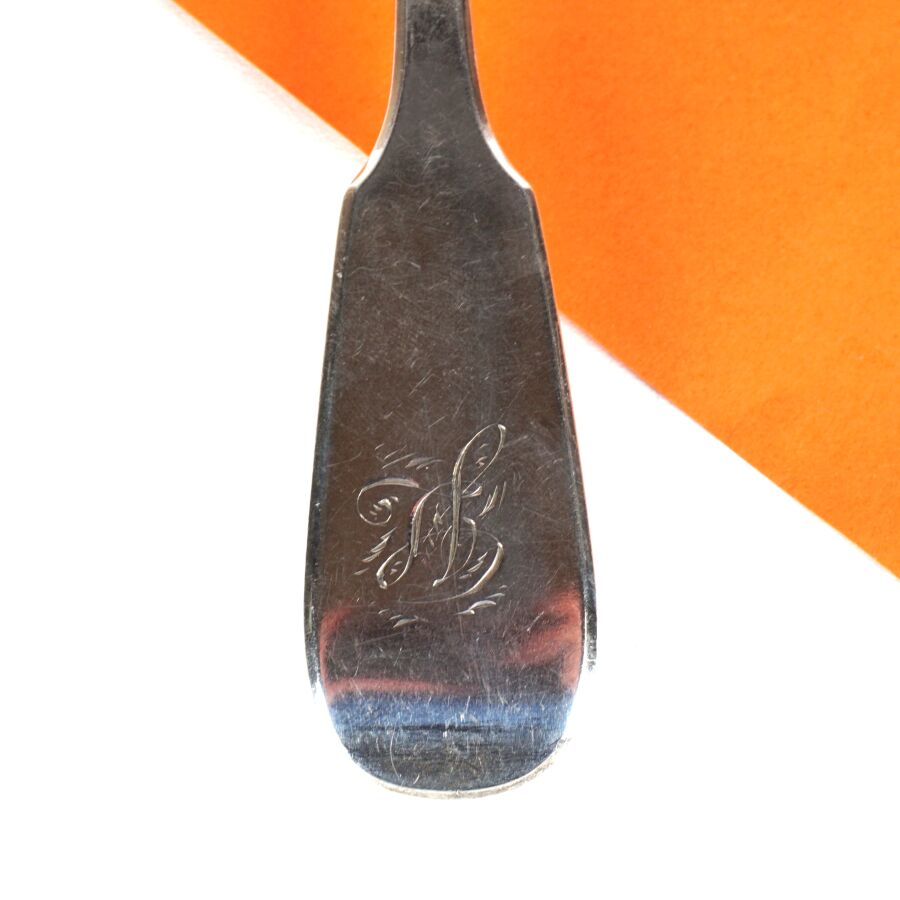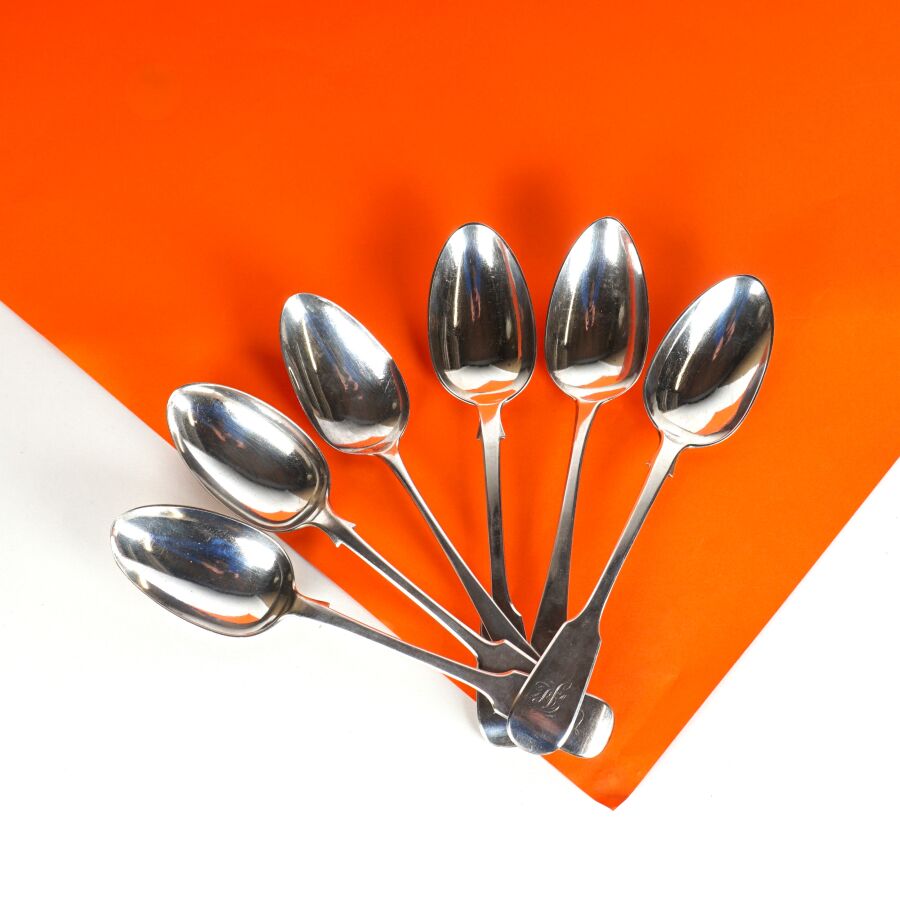 Ensemble de 6 grandes cuillères en argent, poinçon au lion passant pour quatre d'entre elles, trois ornées d'un chiffre ciselé sur le manche, Poids brut : 420 g environ. L. 22.5 cm.