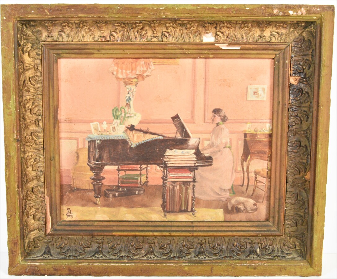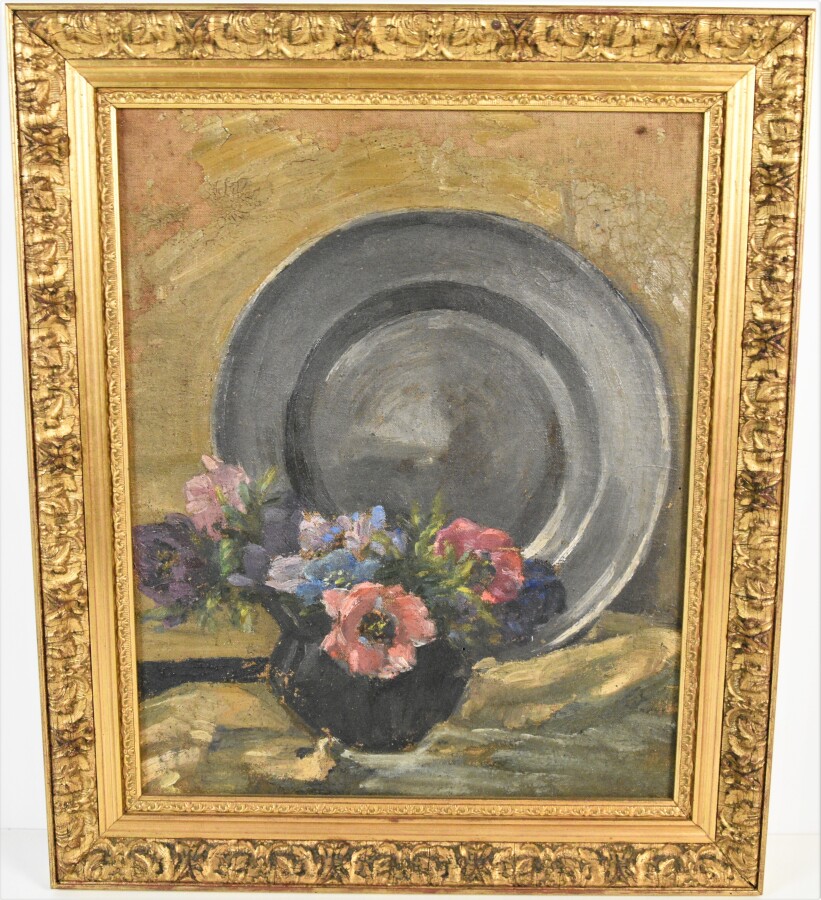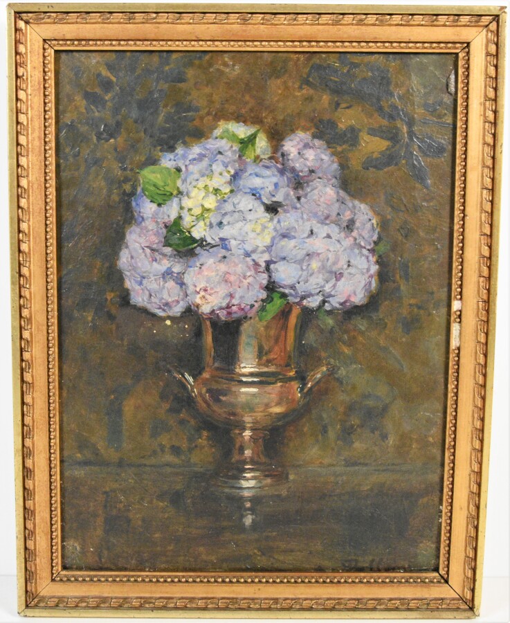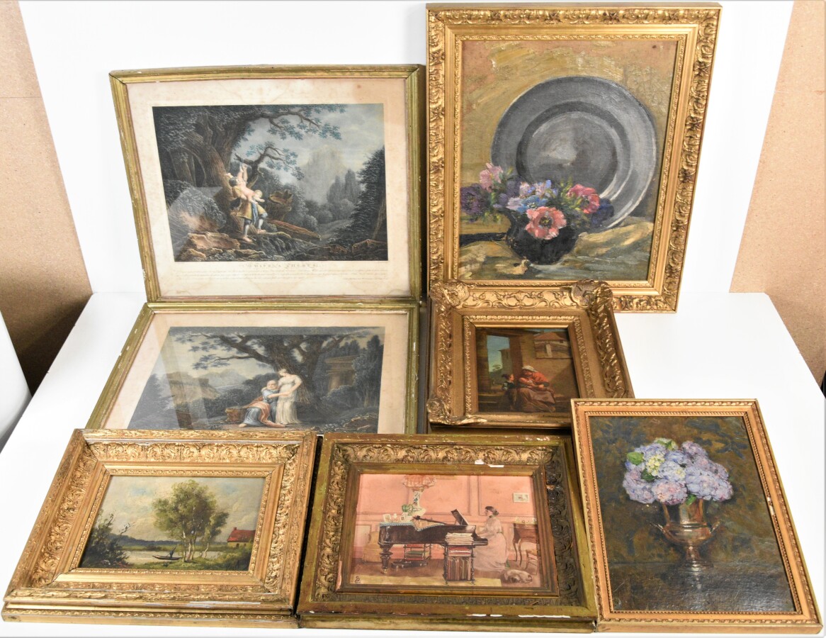 Ensemble de 7 huiles sur toile et huiles sur panneau : "Les hortensias", "Femme au piano", "Paysage à la barque", "Nature morte à l'assiette", "Femme donnant le sein" et deux gravures.