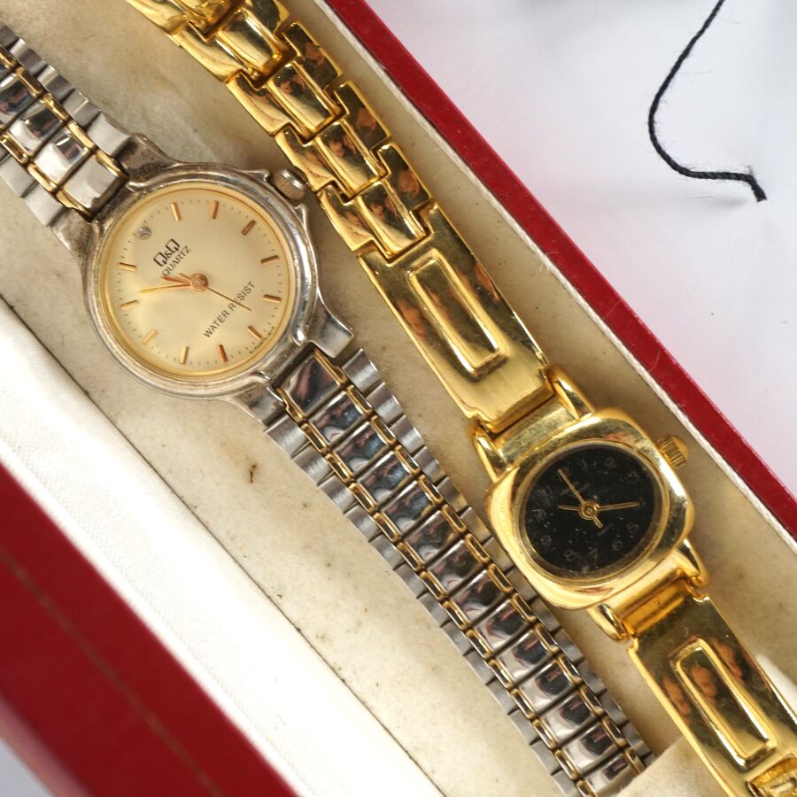 Ensemble de 9 montres de dame de fantaisie principalement en métal doré ou argenté (en l'état).