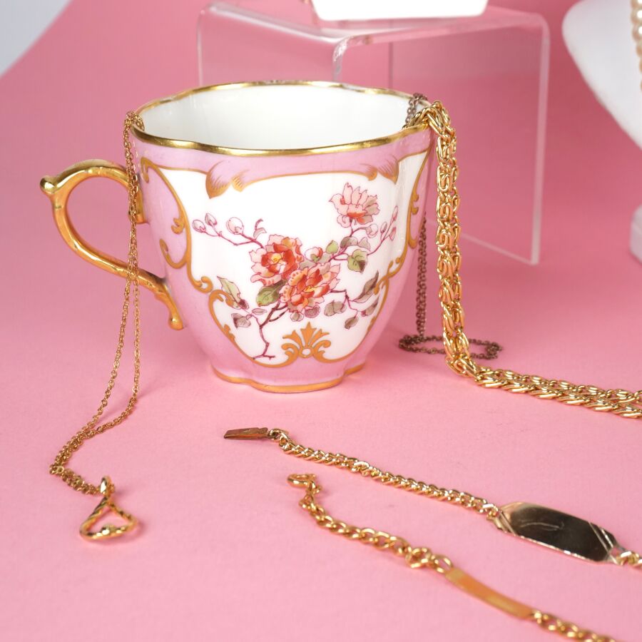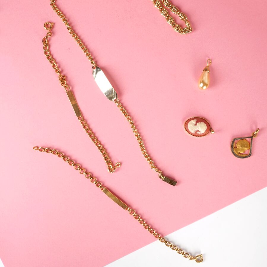 Ensemble de bijoux de fantaisie comprenant : 2 colliers de perles, 9 chaines, 8 pendentifs et 3 bracelets (en l'état).