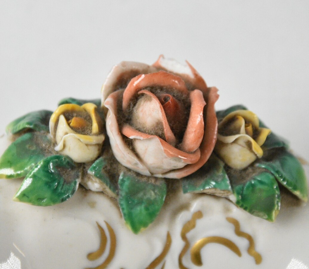 Ensemble de cinq pièces en céramiques comprenant : un rafraichissoir en faïence émaillée polychrome à décor de fleurs et feuillages et de deux têtes de lions retenant des anneaux formant anses, L. 18 cm, un panier et une bannette en porcelaine émaillée polychrome ornés de fleurs en relief et de bouquets, L. 17.5 et 19 cm et deux pots couverts en porcelaine émaillée polychrome à décor de guirlandes de fleurs rehaussé à l'or, H. 13 cm (quelques usures à l'émail et à l'or).