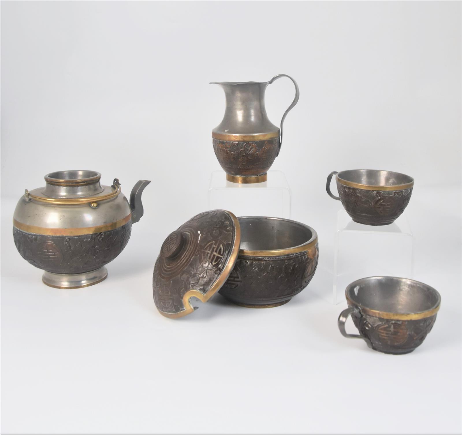 Ensemble de cinq pièces en noix de coco sculptées et étain comprenant : une boîte couverte, une théière, deux tasses et un pichet, Canton, circa 1900, H. de 12.5 cm à 4.5 cm, D. 12,5 cm (petits accidents).