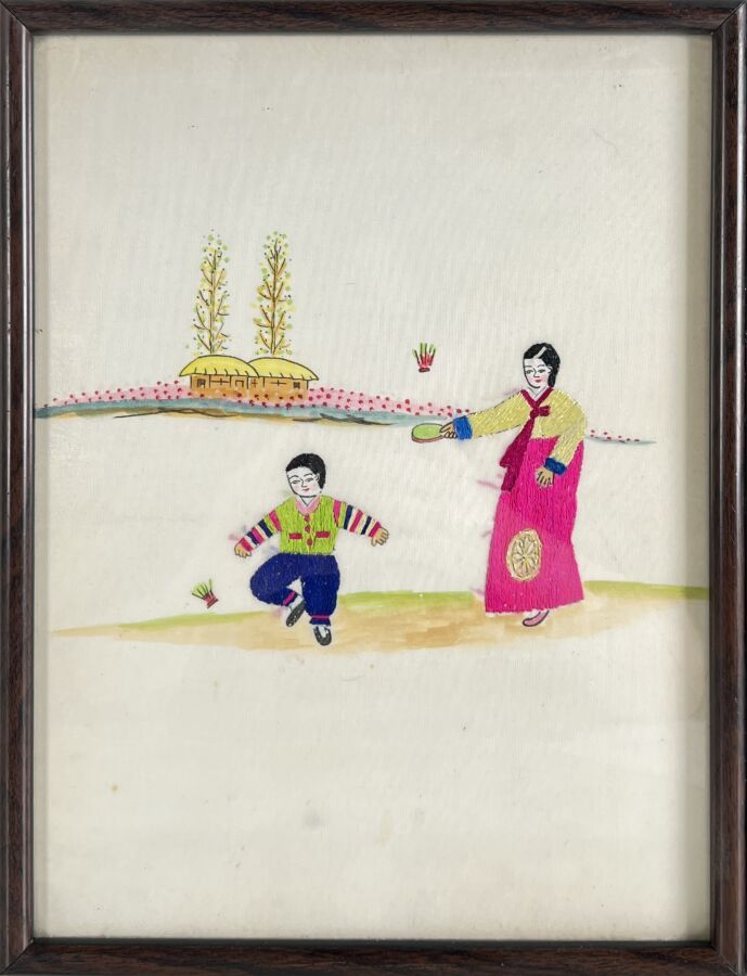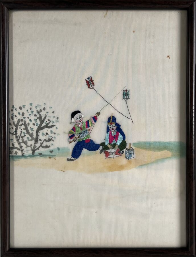 Ensemble de cinq pièces encadrées et une gouache, Chine, travail décoratif moderne, Dim. de 27 x 20 cm à 47 x 56 cm (humidité).