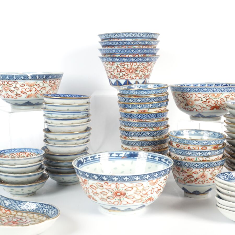 Ensemble de coupes, couvercles, cuillères et présentoirs en porcelaine émaillée polychrome à décor dit en "grains de riz", comprenant 1 grande cuillère formant petit ravier, 7 petites cuillères, 3 grands bols, 4 bols, 11 coupes, 12 soucoupes, 7 petites coupes sur piédouche et 16 petites coupes, Chine, travail moderne (quelques usures, fêles et éclats).