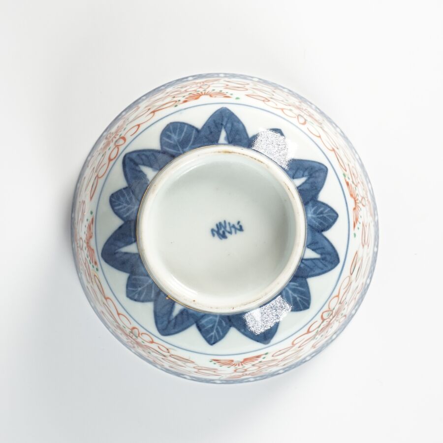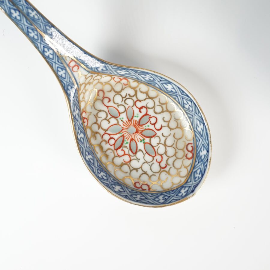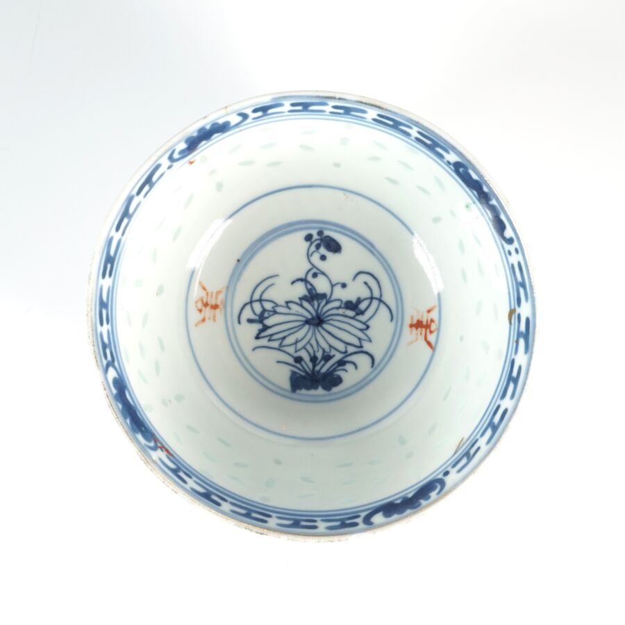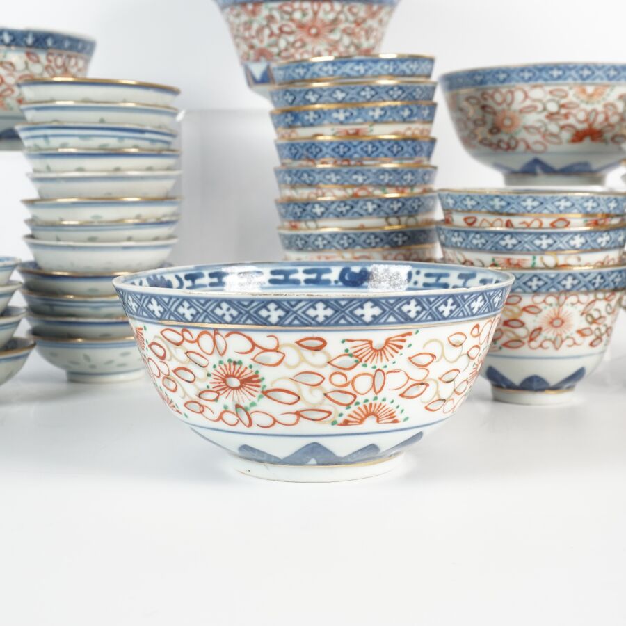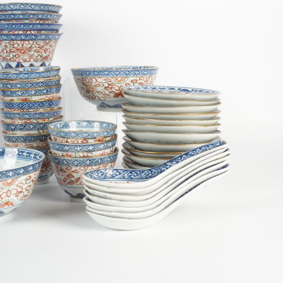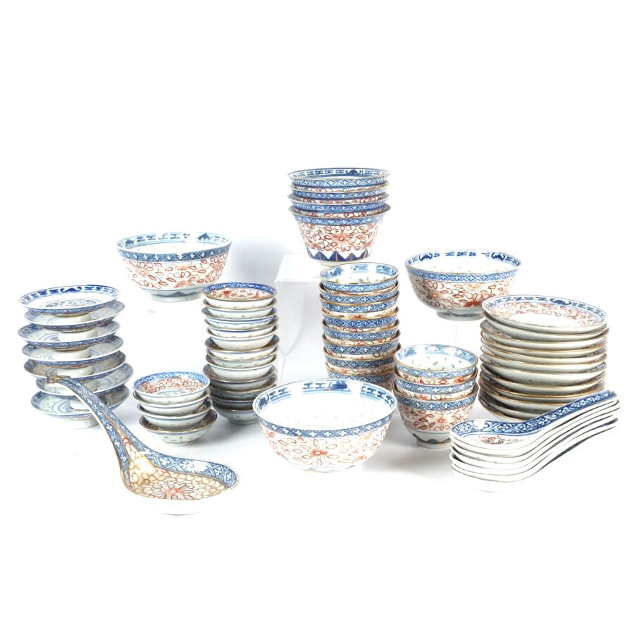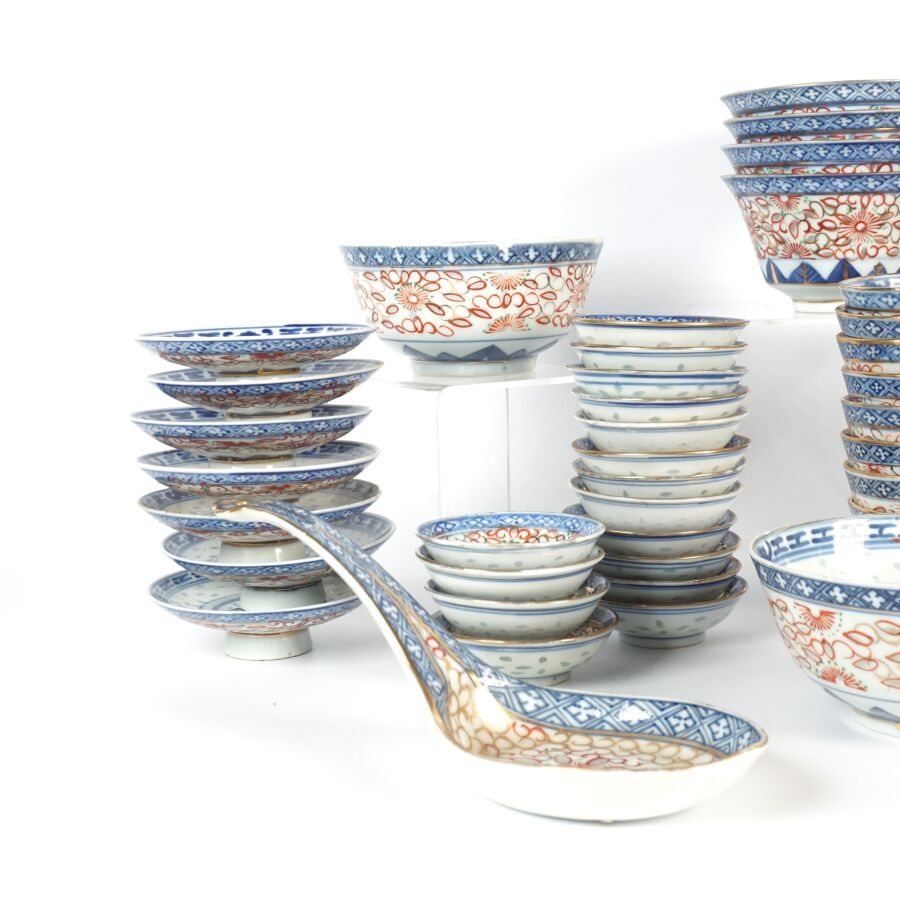 Ensemble de coupes, couvercles, cuillères et présentoirs en porcelaine émaillée polychrome à décor dit en "grains de riz", comprenant 1 grande cuillère formant petit ravier, 7 petites cuillères, 3 grands bols, 4 bols, 11 coupes, 12 soucoupes, 7 petites coupes sur piédouche et 16 petites coupes, Chine, travail moderne (quelques usures, fêles et éclats).