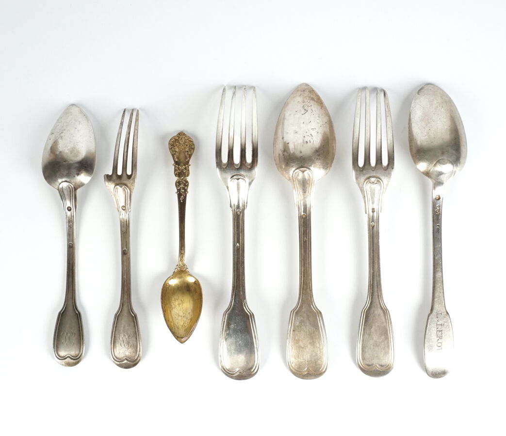 Ensemble de couverts dépareillés en argent, de différents modèles et orfèvres, comprenant : un couvert de pensionnaire accidenté, 2 grandes fourchettes et 2 grandes cuillères et une petite cuillère en vermeil à riche décor feuillagé. Différents poinçons : Ancien Régime, Minerve 1er titre et Vieillard 1er et 2e titre. Poids brut : 418.5 g environ.