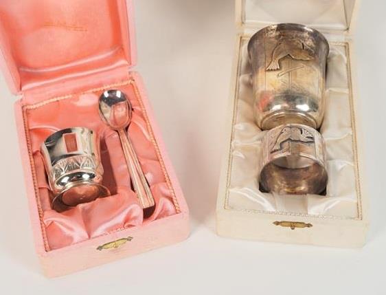 Ensemble de deux coffrets de mariage, l'un contenant une timbale et un rond de serviette en métal argenté, par E.PAVIN-PISSOT à Nantes, à décor d'oiseaux, H. 7.5 cm et D. 4 cm, l'autre contenant un coquetier et sa cuillère en inox, par CIFA La Baule, H. 4.7 cm et L. 11.1 cm.