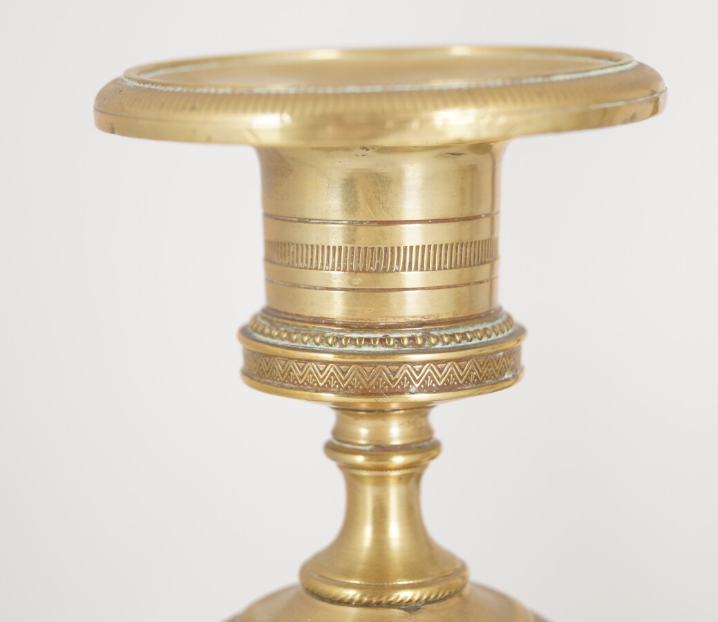 Ensemble de deux paires de bougeoirs en laiton à décor guilloché et godronné, H. 23 cm et 24.5 cm (deux bobèches rapportées, usures).