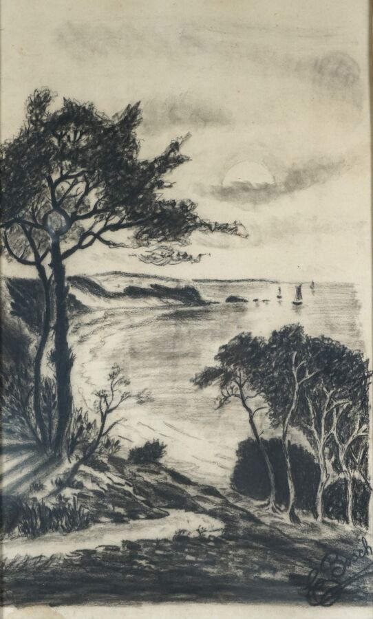 - E. BOSCH (XIX-XXe), "La plage", dessin signé en bas à droite, 46.5 x 28 cm (à vue) (taches).