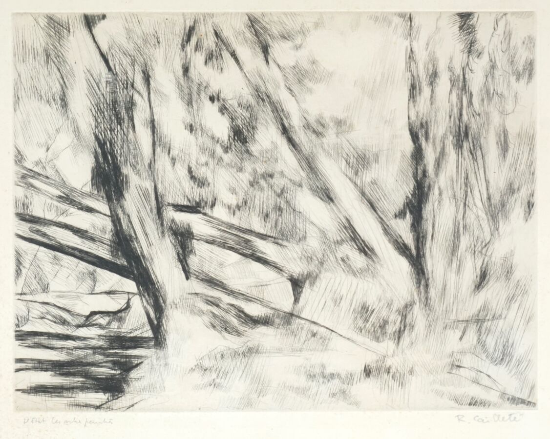 - R. CAILLETE (XXe), "Les arbres", estampe justifiée en bas à gauche, titrée et signée en bas à droite, 28.5 x 35 cm (à vue) (rousseurs).
