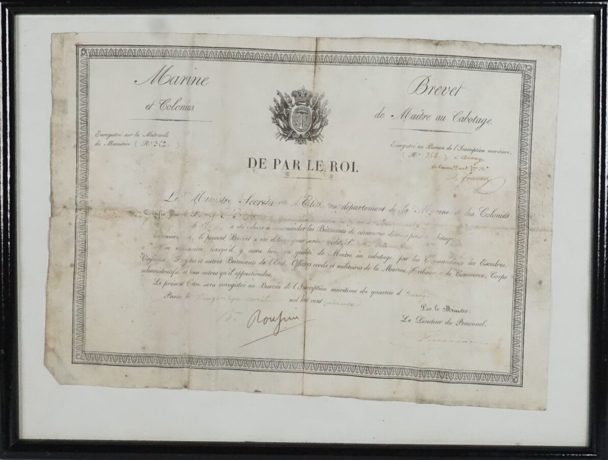 SECOND EMPIRE - MARINE & COLONIES - BREVET DE MAITRE AU CABOTAGE, sur vélin, décerné en 1854, vignette, 24 x 35 cm ;