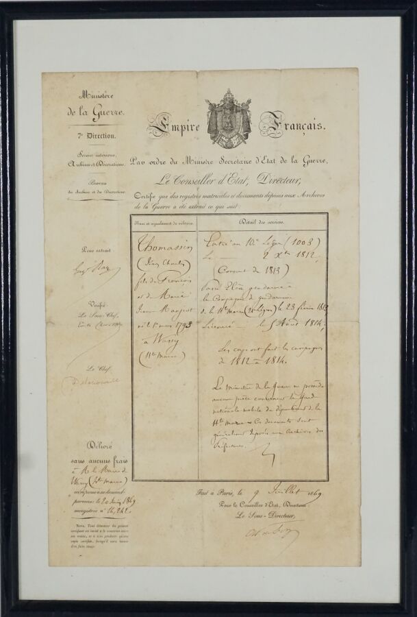 SECOND EMPIRE - ETATS DE SERVICE D'UN ELEVE GENDARME, décerné en 1869, vignette, cachet à sec, 38 x 24 cm ;