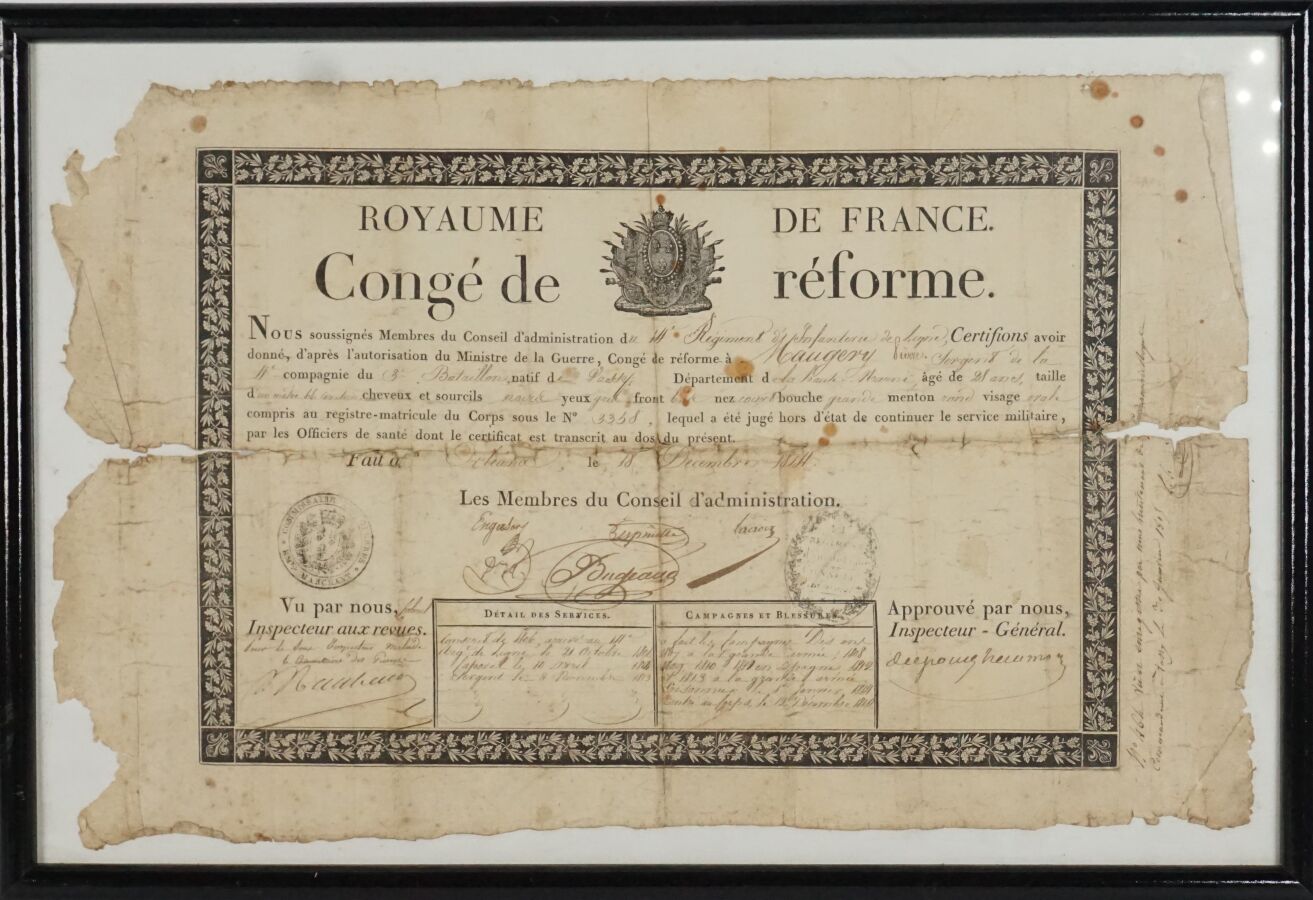 RESTAURATION - CONGE DE REFORME, décerné en 1814, vignette, cachet humide, nombreuses signatures, 26 x 40 cm, pliures, accidents et manques ;