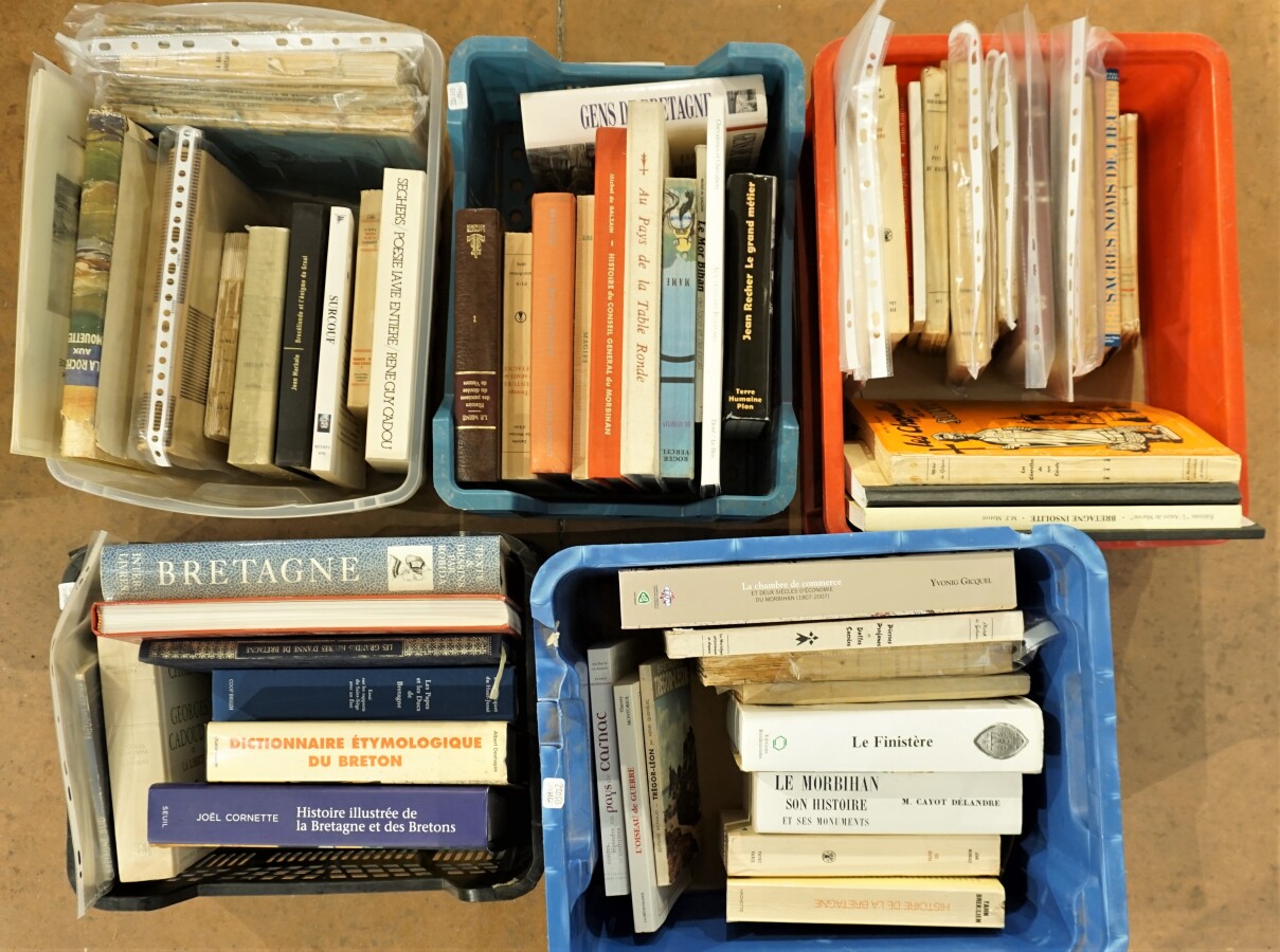 Ensemble de livres sur la Bretagne dans 5 caisses en plastique, brochés et reliés dont : de Galzain - Cornette, Histoire illustrée de la Bretagne et des bretons - Robida, Bretagne - etc.