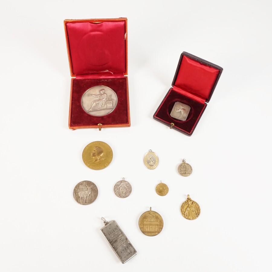 - 10 médailles ou médailles à bélière, en bronze et autres métaux, dont Saint Hubert, Compagnie Générale Transatlantique, D-day, Edouard VII, église de Rome et divers.*