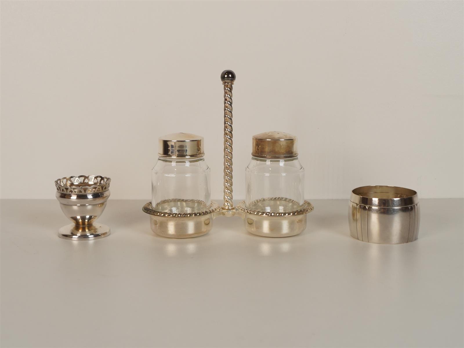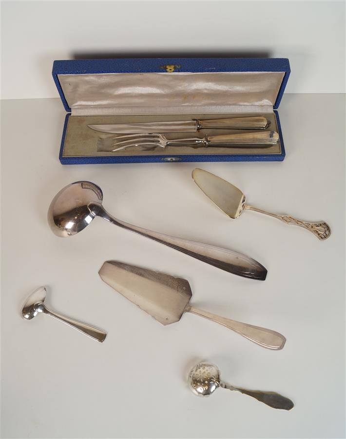 Ensemble de métal argenté dépareillé comprenant : pelles à tarte, louche, moutardier, vide-poche Ercuis, salière-poivrière, saupoudreuse, timbale, coquetier, couvert à découper en coffret et divers.