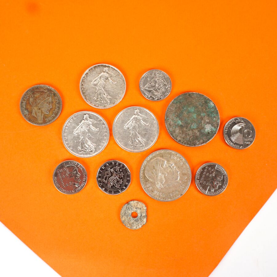 On y joint 7 monnaies divers dont 3 x 10 francs Robert SCHUMAN 1986.