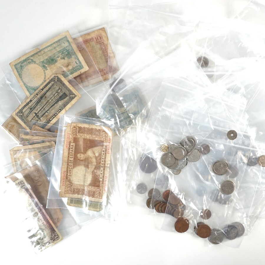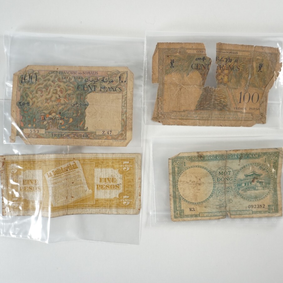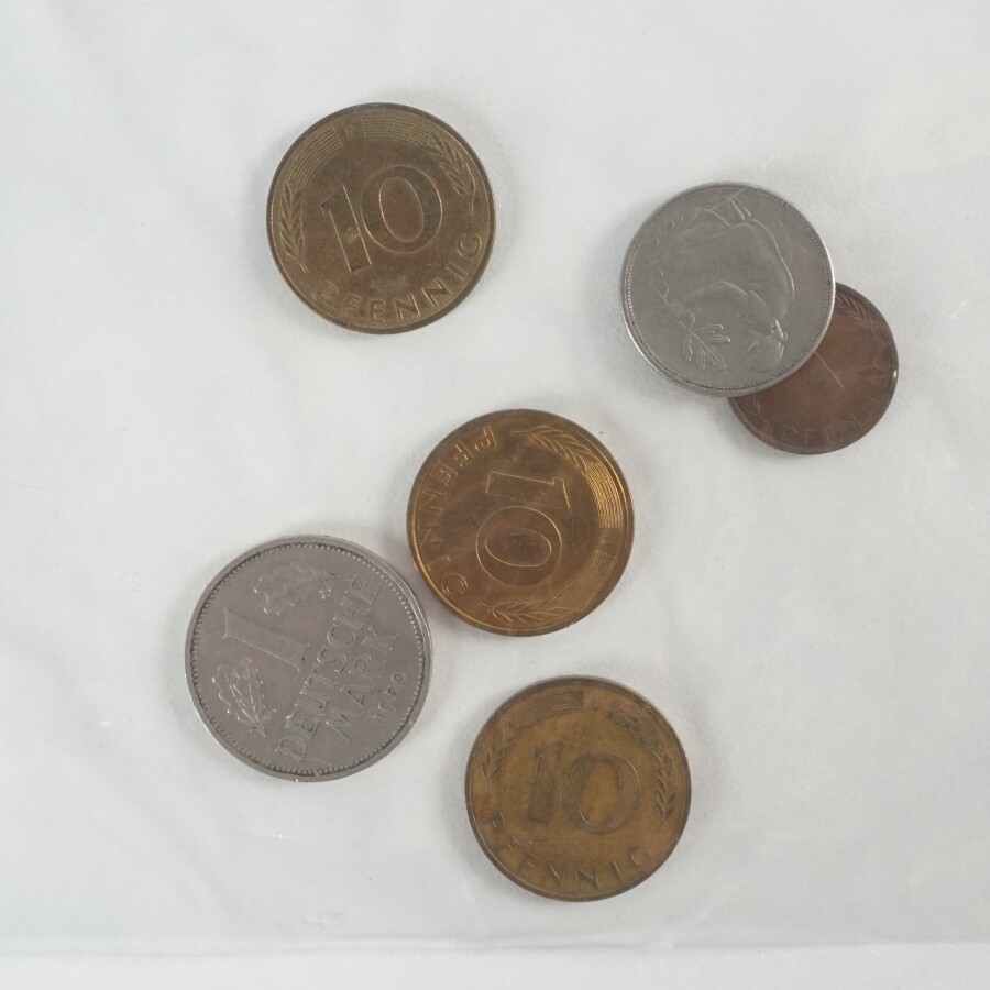 Ensemble de monnaies et billets divers, comprenant notamment 10 et 20 Pfennig (1969, 1972 etc), Francs Maroc, Florins Australie, 20 et 100 Francs Algérie, Bons pour 2 Francs, Polynésie, Penny Australie, Deutsche Mark, etc.