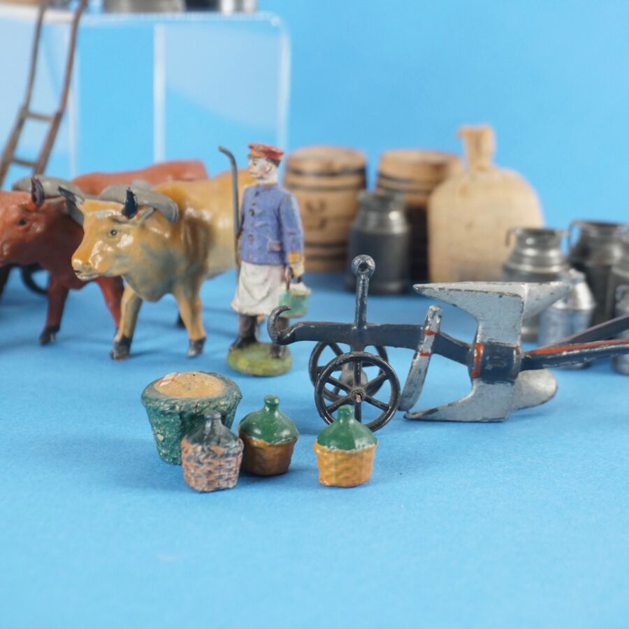 Ensemble de personnages et accessoires divers sur le thème de la ferme, métal et matières composites comprenant sacs et tonneaux, boeufs, pots à lait, jarres, chevaux, personnages (usures, en l'état, possibles repeints).
