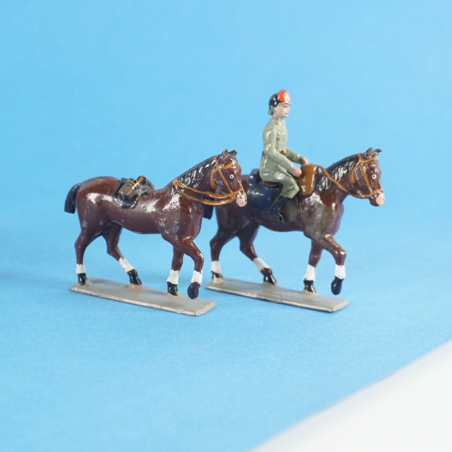 Ensemble de personnages et accessoires militaires en métal peint, l'ensemble dépareillé, comprenant deux canons, un cavalier, deux attelages de deux chevaux chacun dont un avec deux personnages et un cheval monté et deux chevaux (sans cavaliers) (usures, écaillures, possibles repeints).