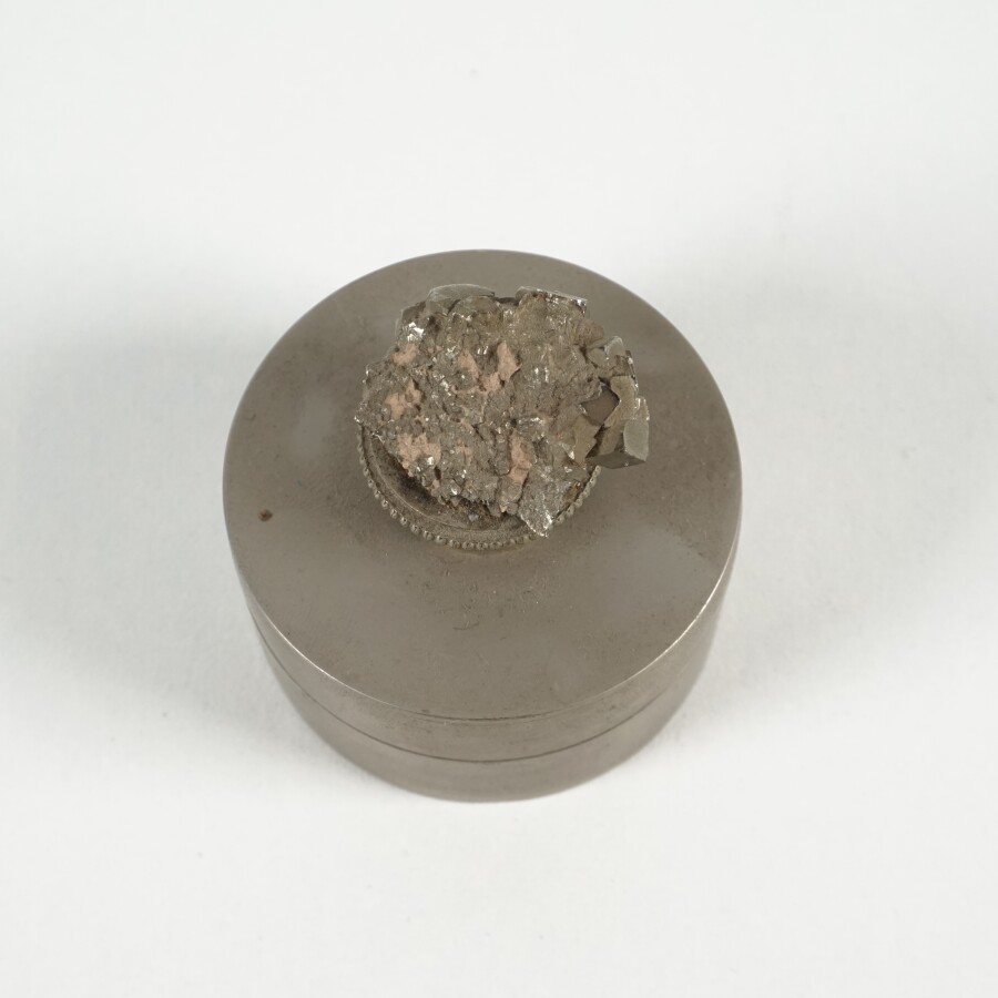 - une petite boîte ronde en métal argenté, le couvercle orné d'une pyrite ;