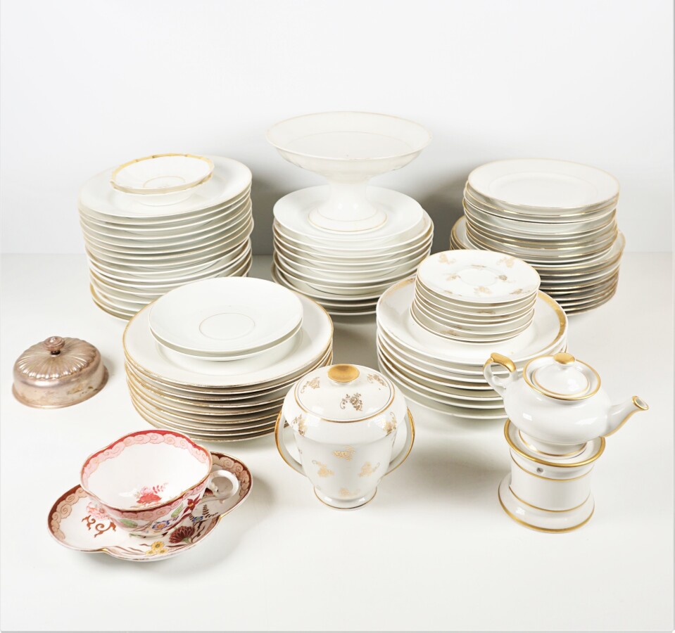 Ensemble de pièces de services de table dépareillés en porcelaine blanche et liseré or comprenant: 24 assiettes d'un modèle 9 assiettes d'un autre, 8 petites assiettes, 11 petites assiettes d'un autre modèle, 9 assiettes creuses, 1 coupe sur pied, 1 tisanière, 2 soucoupes en porcelaine de Nast.