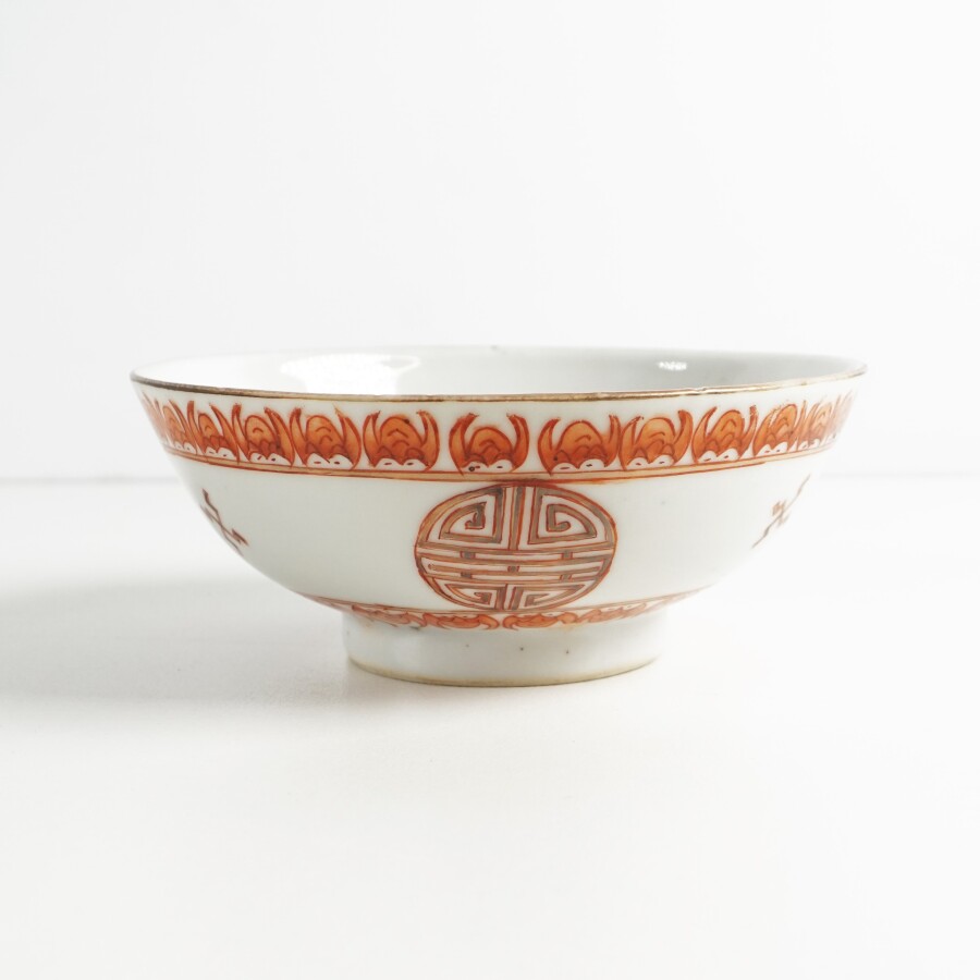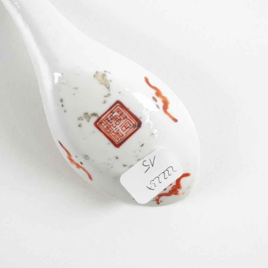 Ensemble de porcelaines à décor en émail corail comprenant une paire de coupes avec une cuillère à décor des caractères Shou et chauves-souris (Diam : 11.9 cm) ; une coupe à décor des Wufu, pêche, citrons digités et grenade (Diam : 8.7 cm) ; une sous-tasse du même décor (Diam : 13.7) et une tabatière à décor d'un guerrier en armure, H. 8 cm, Chine, deuxième moitié du 19ème siècle (petites usures à l'émail).