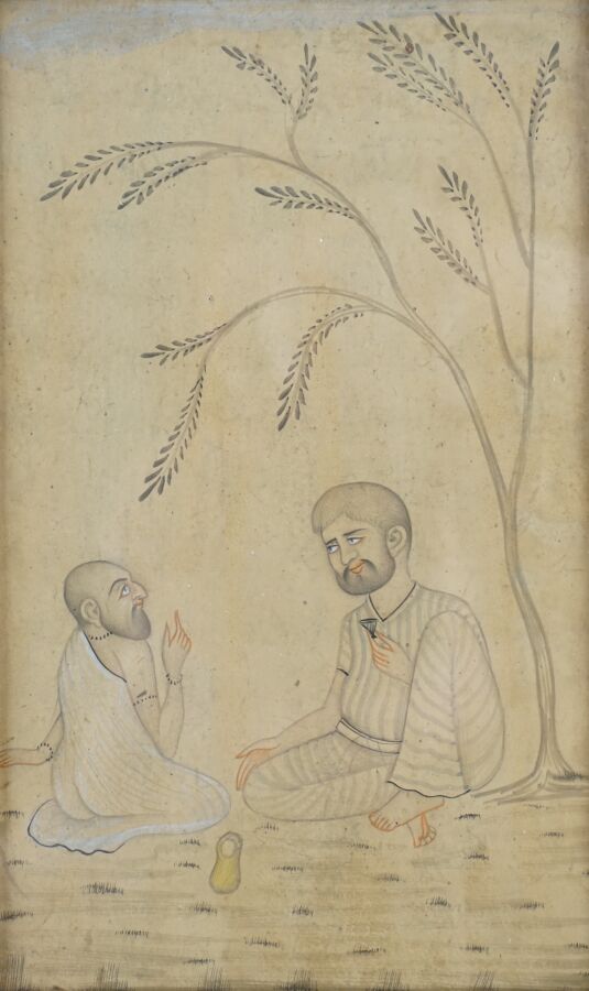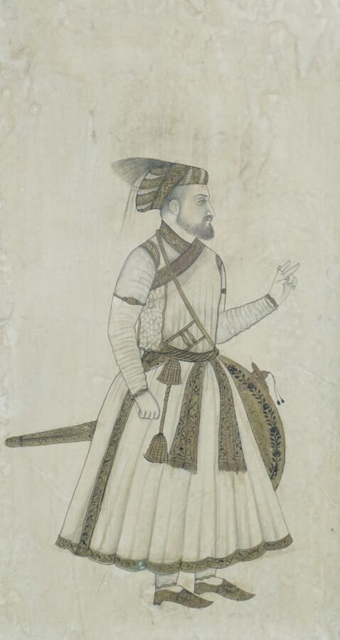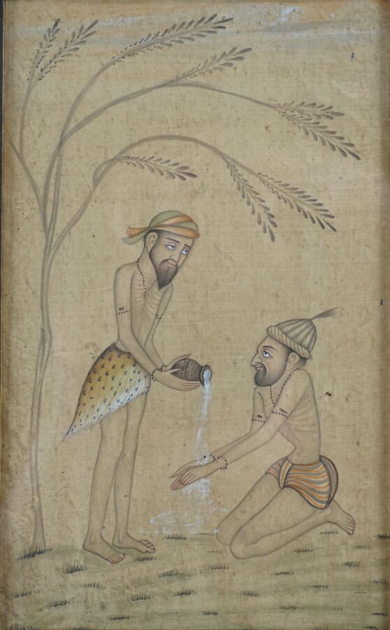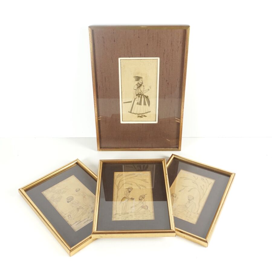 Ensemble de quatre encres et rehauts d'or, sur papier représentant trois Sadu et un prince en tenue traditionnelle, Inde du nord, 20ème siècle, H. 16.5 x 9 cm (pour le prince) et 15 x 9.2 cm (pour les trois Sadu) (quelques traces et taches d'humidité, petites pliures).