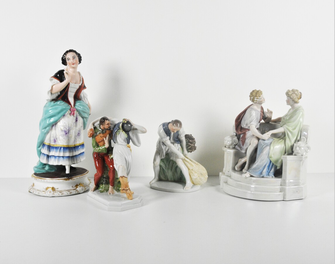 Ensemble de quatre groupes de personnages en porcelaine émaillée représentant une scène à l'antique, un pêcheur tirant son filet, deux personnages s'aidant et une femme, deux groupes marqués du tampon HEREND HUNGARY dessous, H. de 19 cm à 38 cm (accidents).