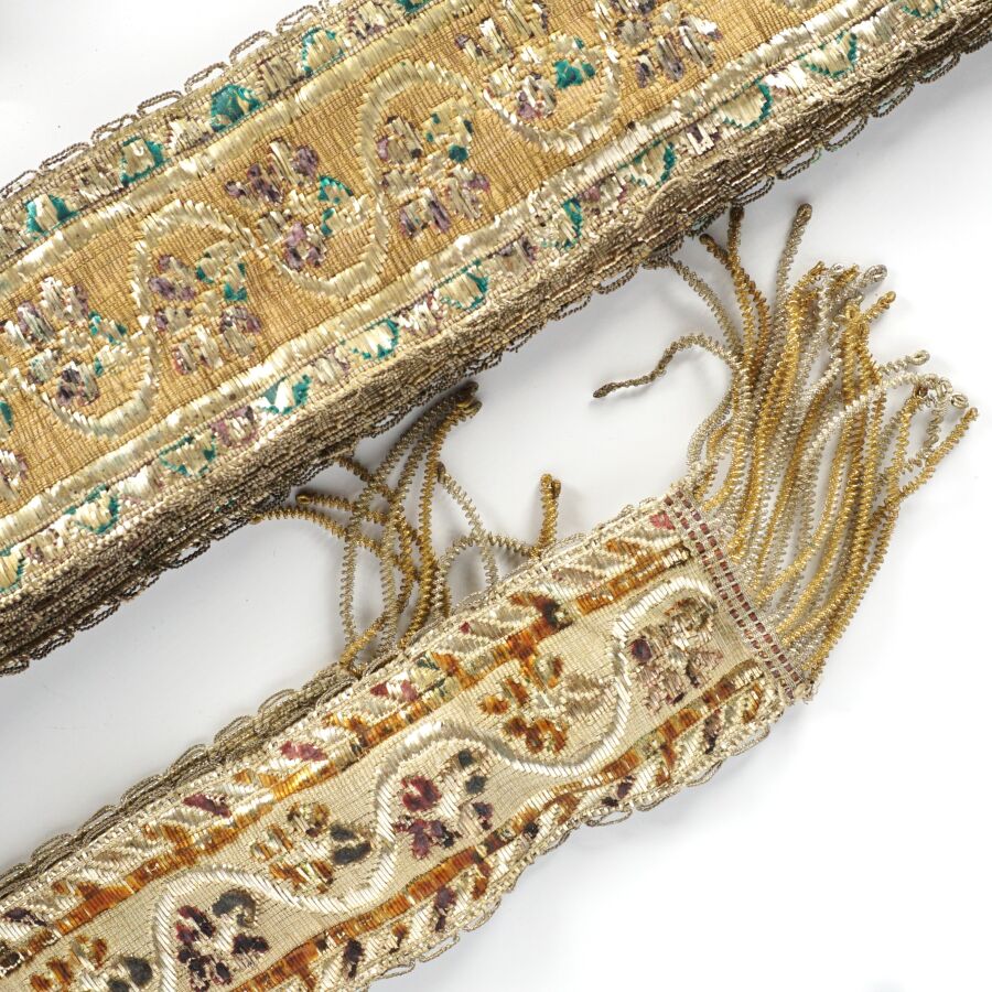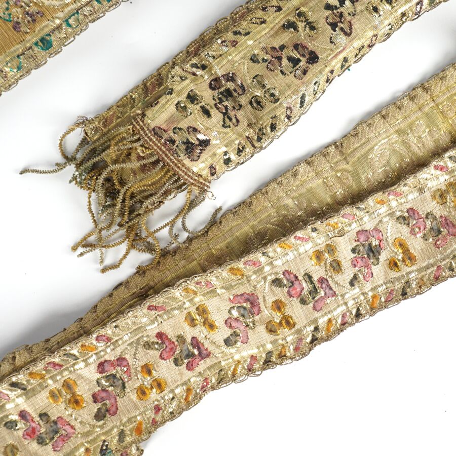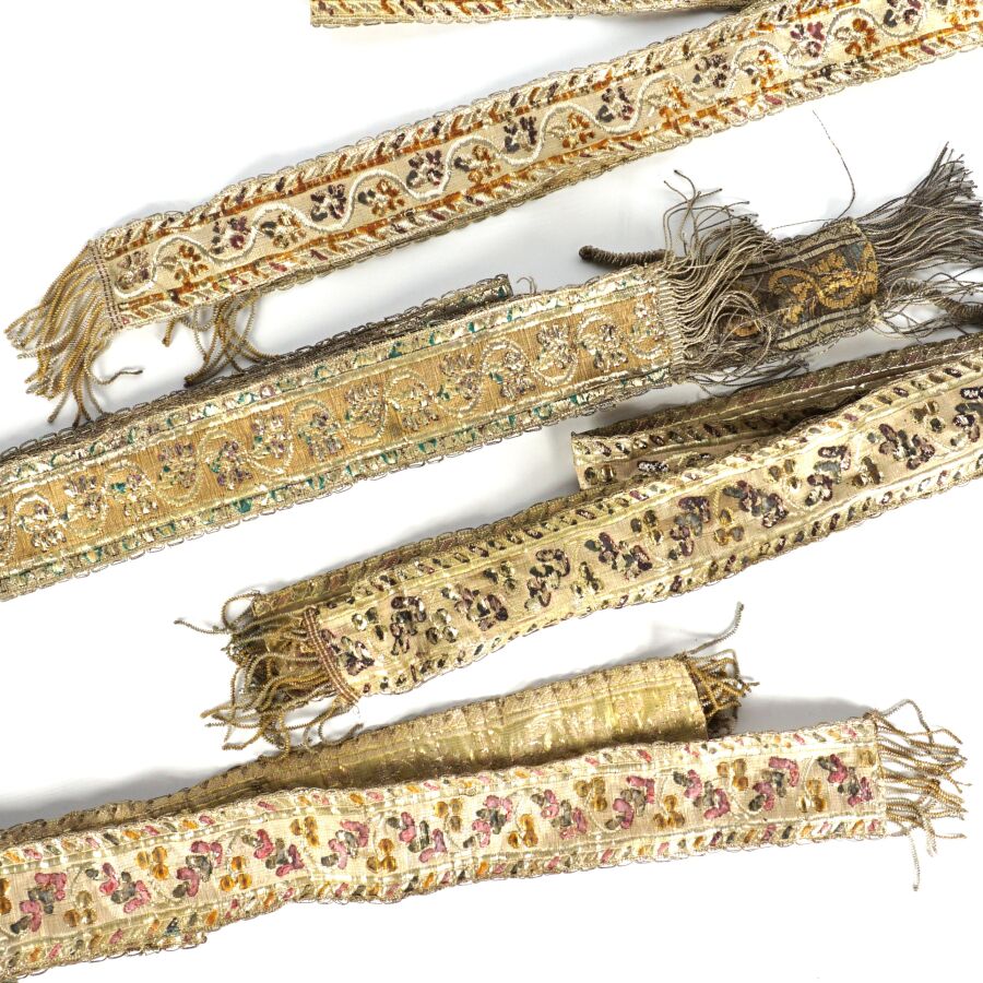 Ensemble de quatre rubans formant ceinture en métal tissé à décor de fleurs et feuillages, Bretagne, 19ème siècle, L. 165 cm, 170 cm, 160 cm et 163 cm environ.
