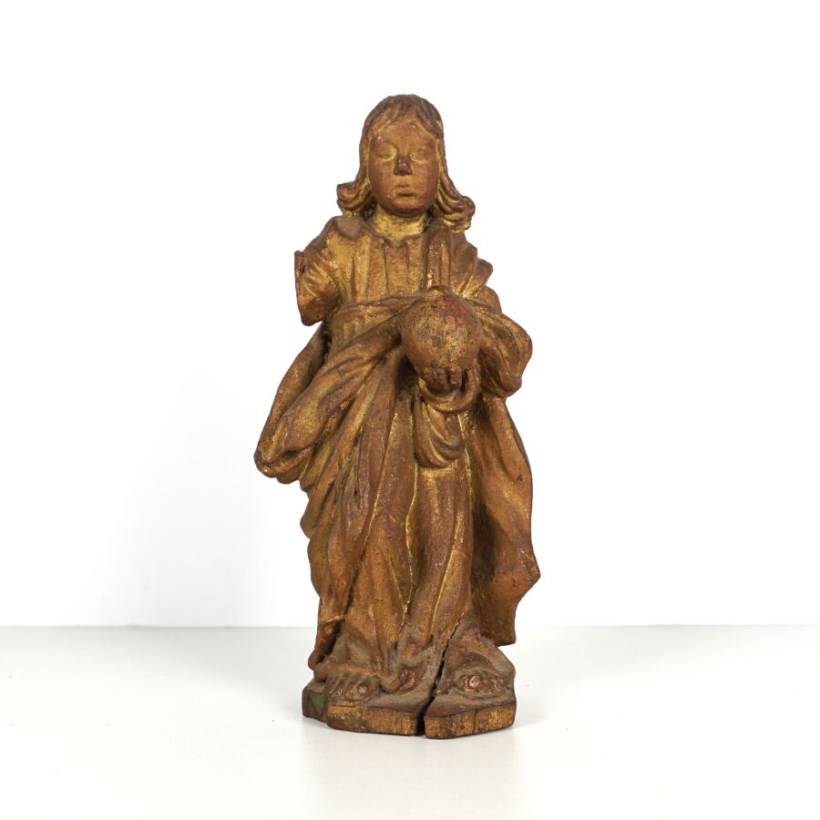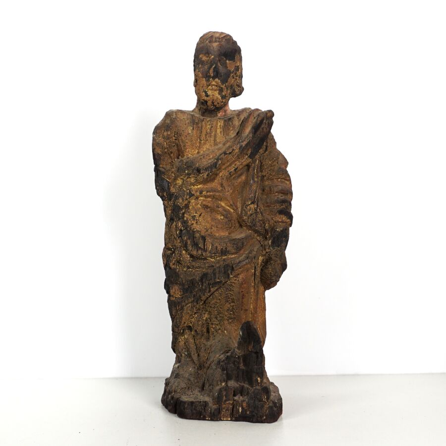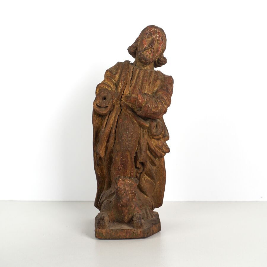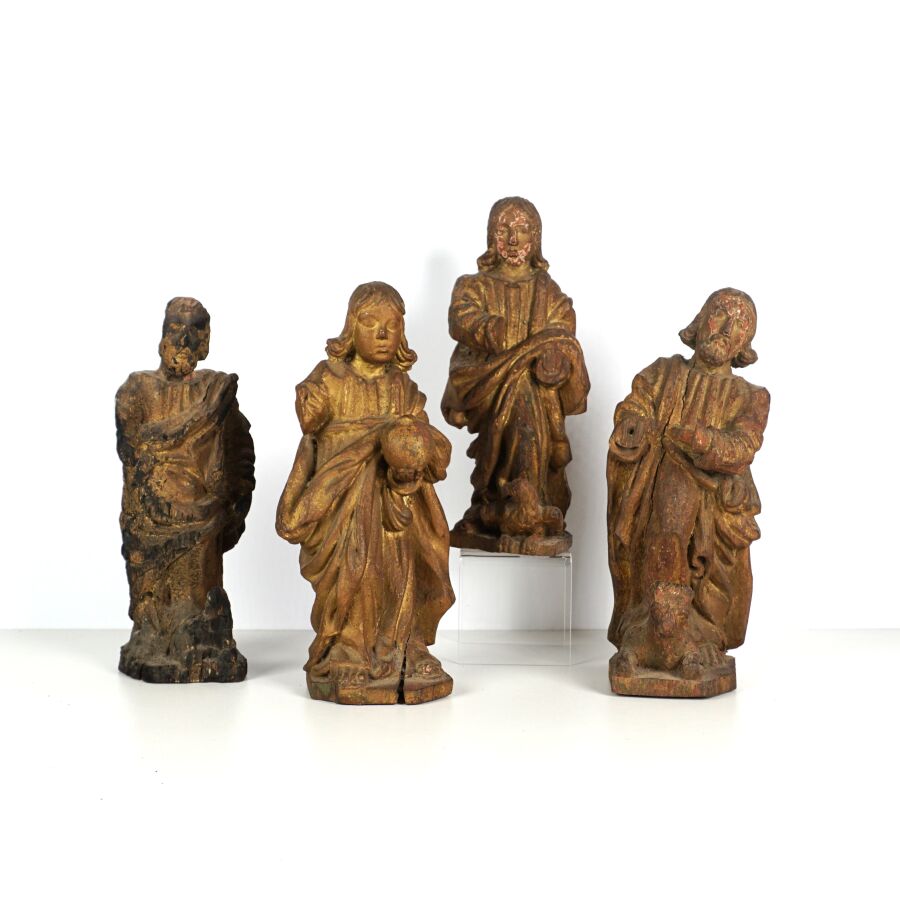 Ensemble de quatre statuettes en bois, anciennement polychromées, représentant les quatre évangélistes, première moitié du 18ème siècle, H. 26 cm (accidents, manques, l'une des statuette en partie brulée).