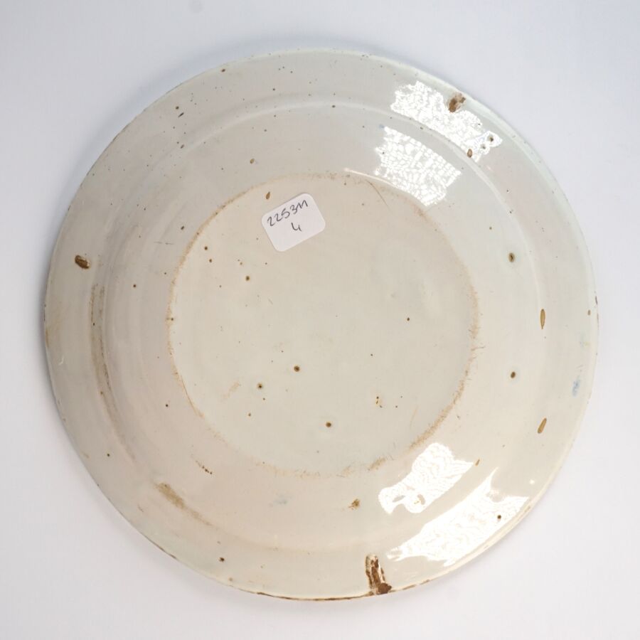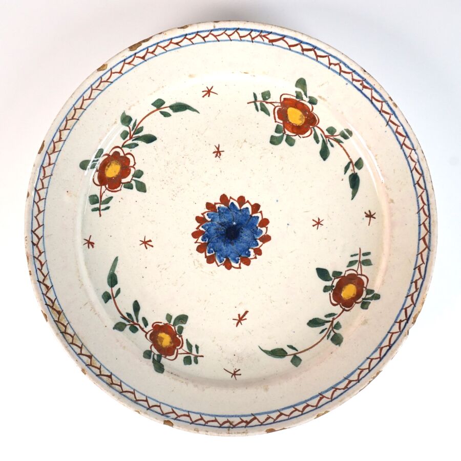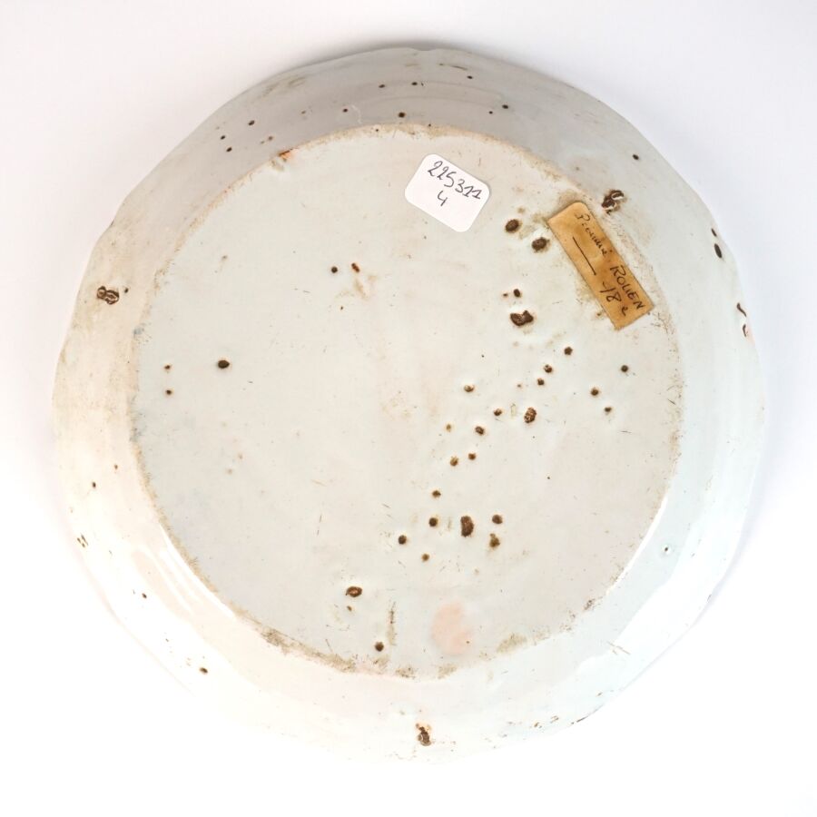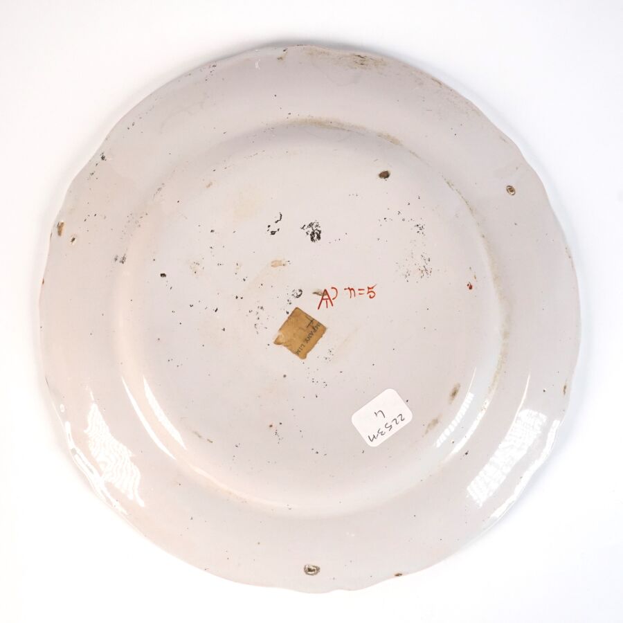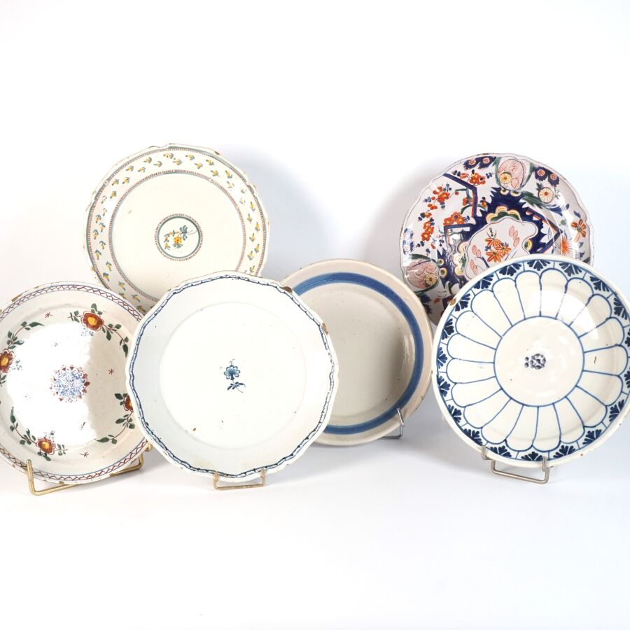 Ensemble de six assiettes en faïence émaillée polychrome, divers décors et manufactures dont Rouen et Nevers, 18ème et 19ème siècles, Diam. De 22.5 cm à 23.3 cm (quelques sauts et éclats).