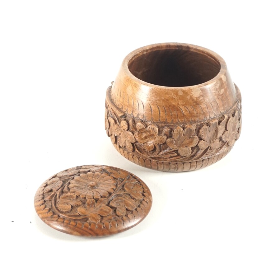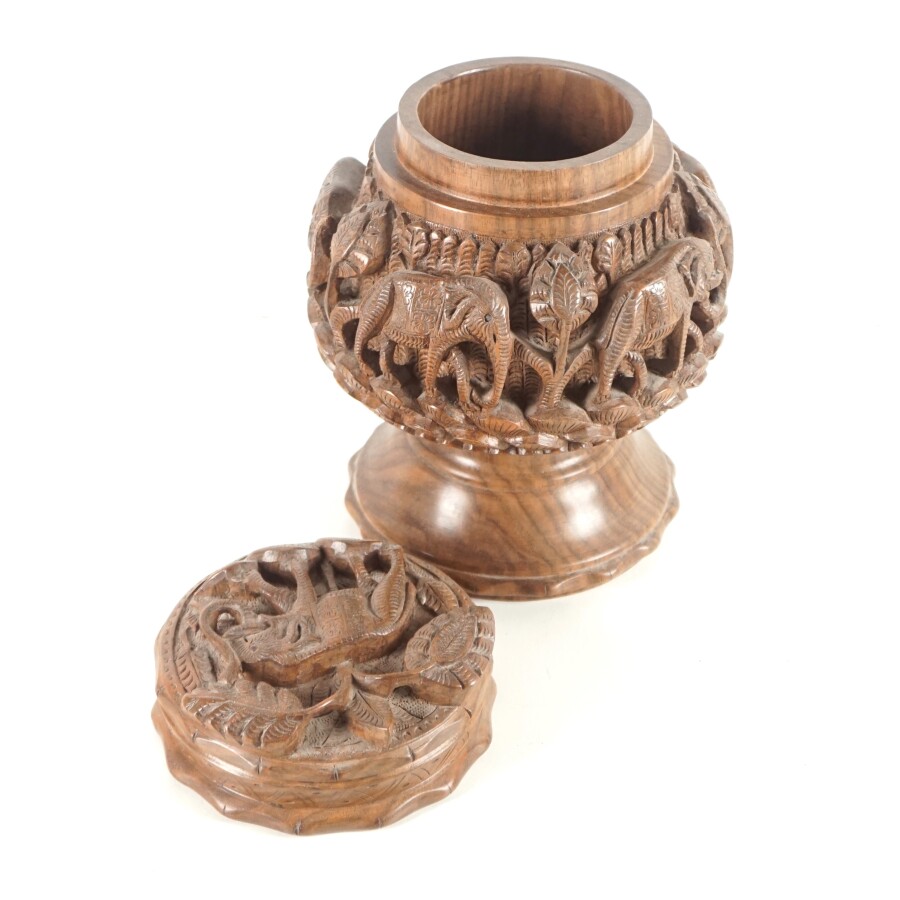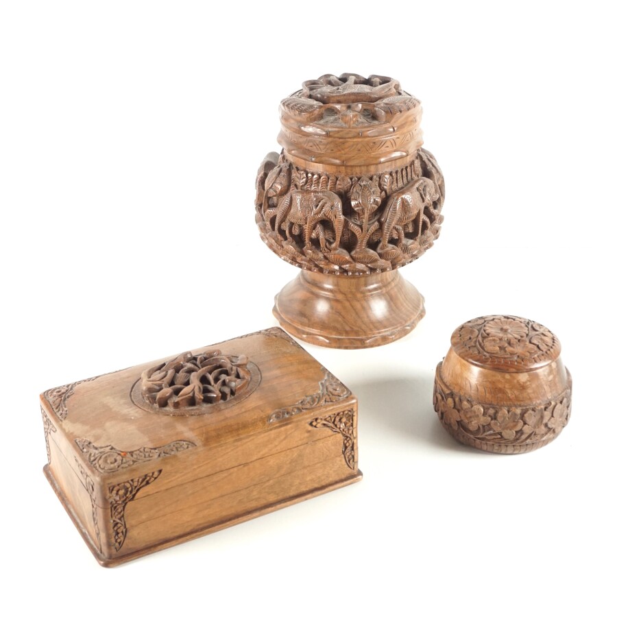 Ensemble de trois boîtes, bois sculpté à décor tournant de feuillages, rinceaux et éléphants, l'une sur piédouche, Inde, travail décoratif moderne, H. 9 cm à 22 cm.